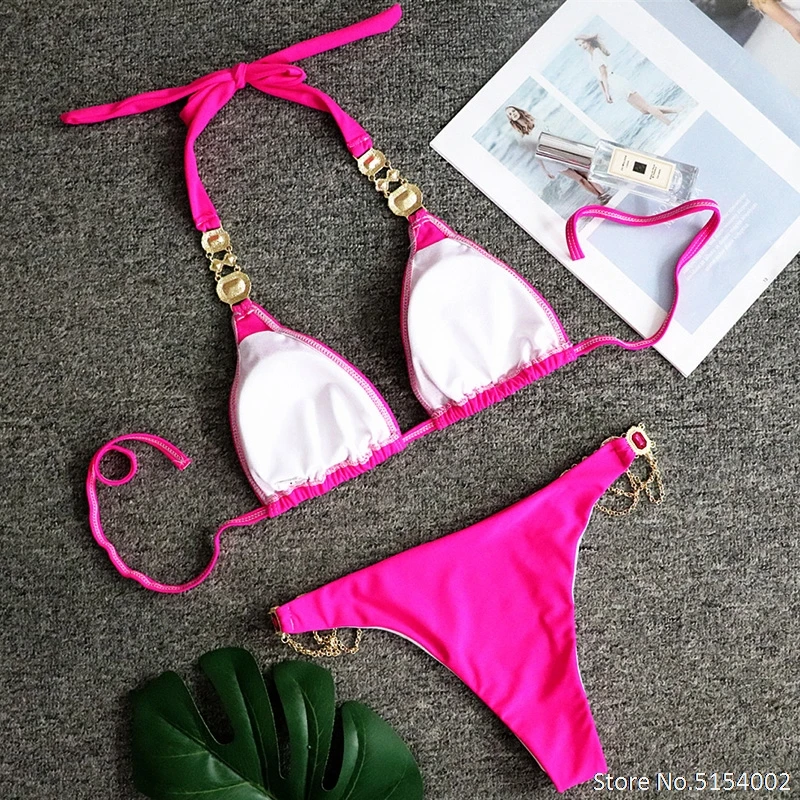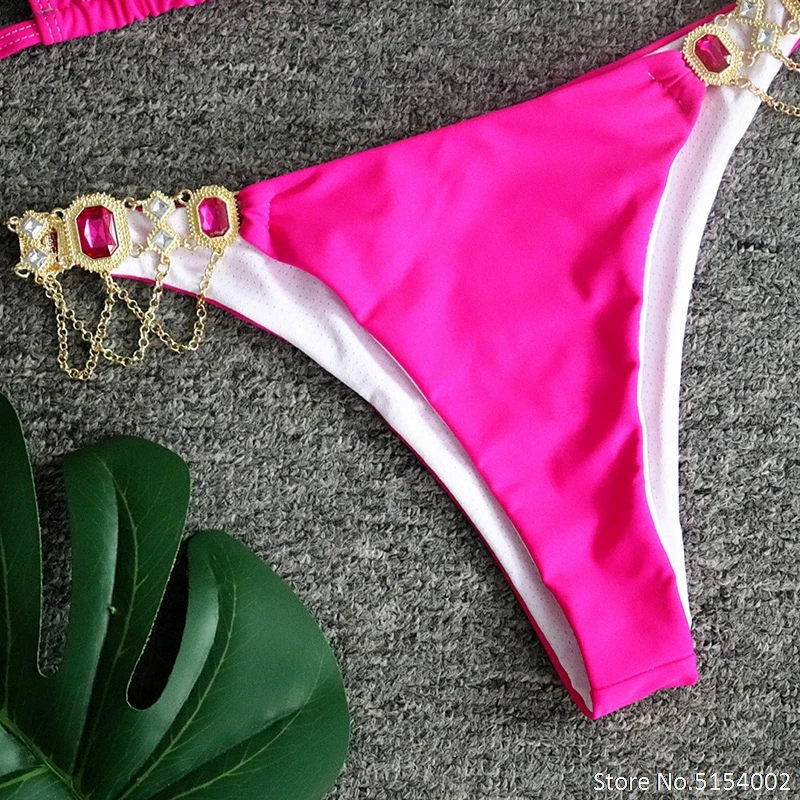 Стразы, бикини 2022, блестящий купальник, женские бикини, комплект бикини с кристаллами и бриллиантами, купальник с металлической цепочкой, женский купальный костюм-бандо