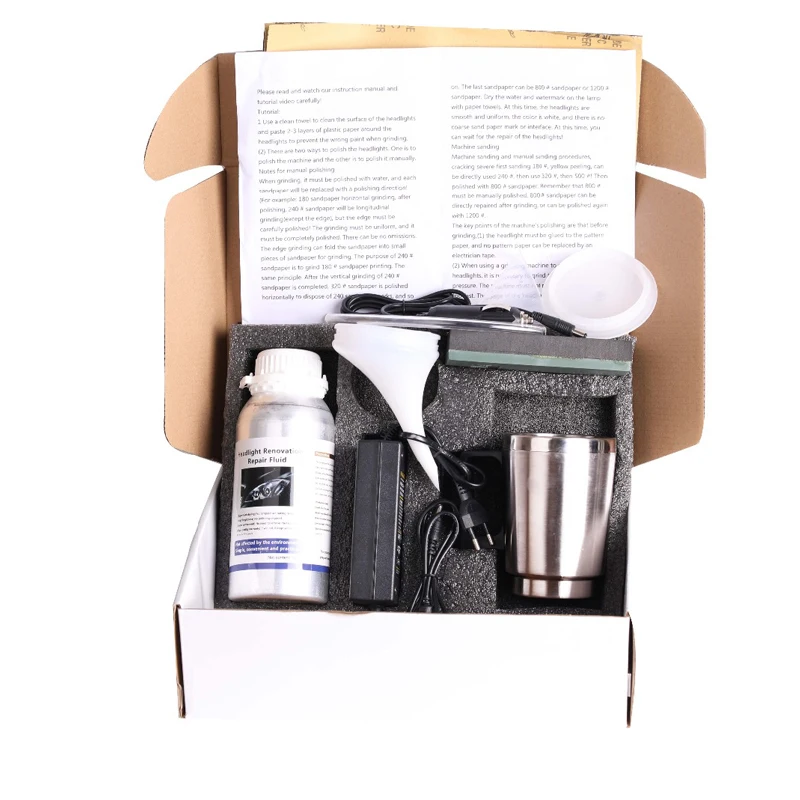 Особенности: В основном фиксируют шелушение фар, пожелтение, царапины, ямы и другие признаки. Восстановление царапин, увеличение роли блеска и равномерно протирать полотенцем. Спецификация: Емкость: 800 г Посылка: 32x23x 9 см/12.6x9.06x3.54 дюйма Количество: 1 комплект Посылка включает в себя: 1 х стеклянное гидрофобное покрытие 6 наждачных работ Чашка-1 шт. крышки-2 шт. Адаптер питания + вилка