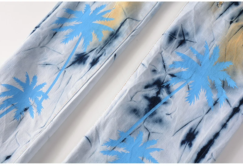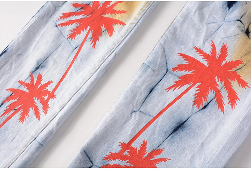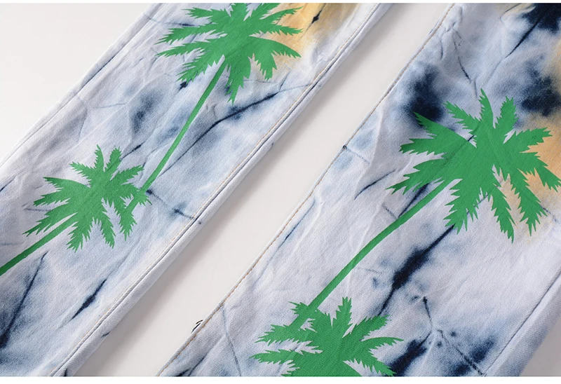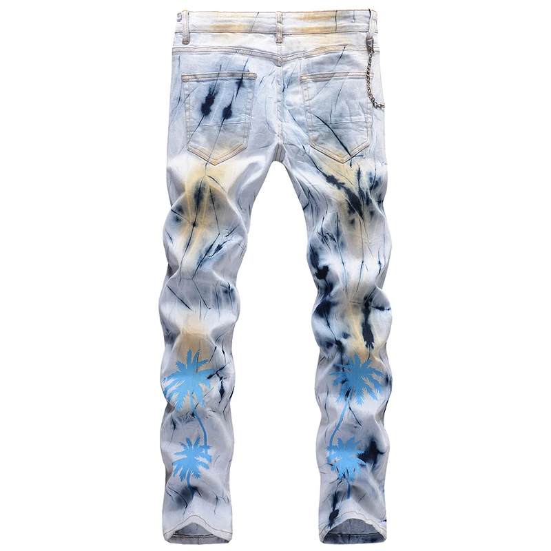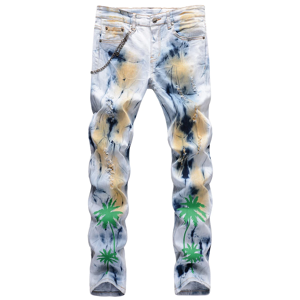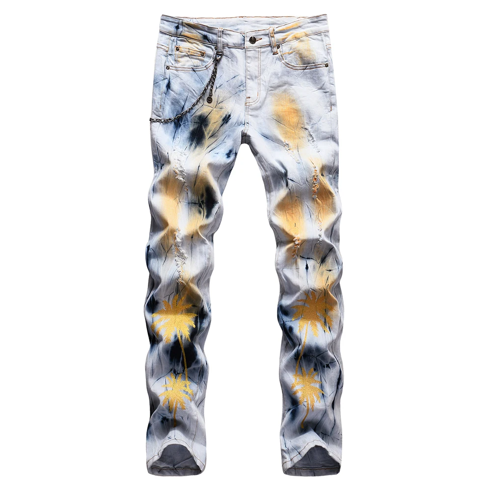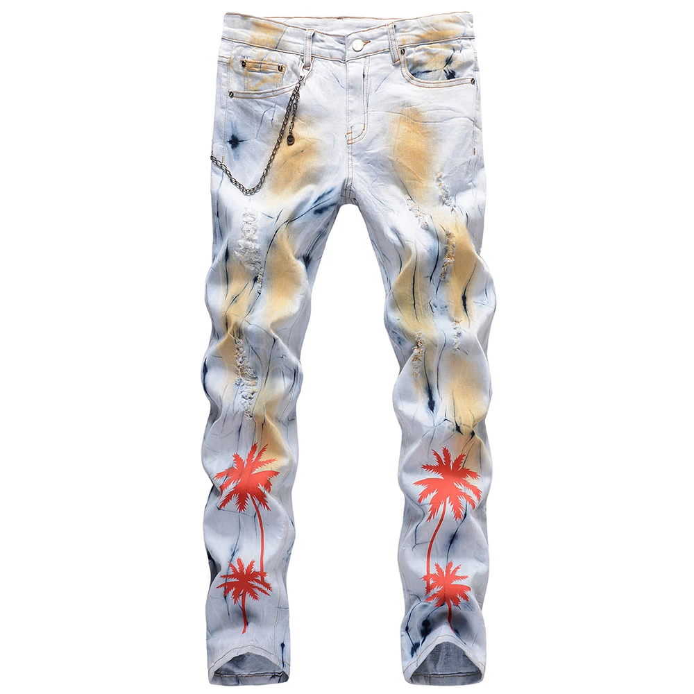 Мужские рваные джинсы с принтом кокосовой пальмы и цепочкой Y2K, уличная одежда, узкие Стрейчевые джинсовые брюки