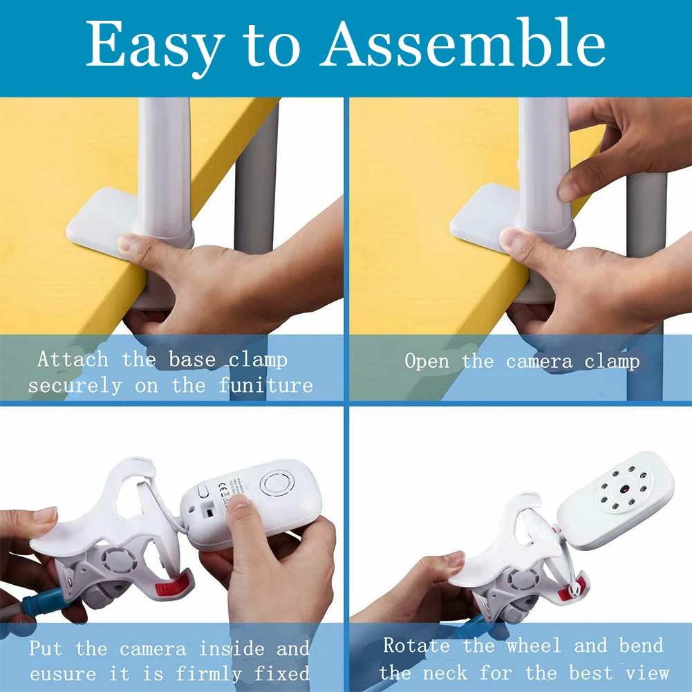 * 3. Прост в использовании, не нужно нажимать на стену, нет необходимости сверлить отверстия-держатель детской камеры имеет прочный зажим, который можно надежно прикрепить к большинству поверхностей и легко зафиксировать на мебели в комнате. Согните и поверните его, чтобы изменить положение монитора ребенка по мере необходимости для достижения наилучших результатов. Подставка для камеры прочная и надежная. Детская камера надежно фиксируется в зажиме и поддерживается резиновой силиконовой лентой. Кронштейн не повреждает кроватку или мебель. Пожалуйста, следуйте инструкциям по установке.