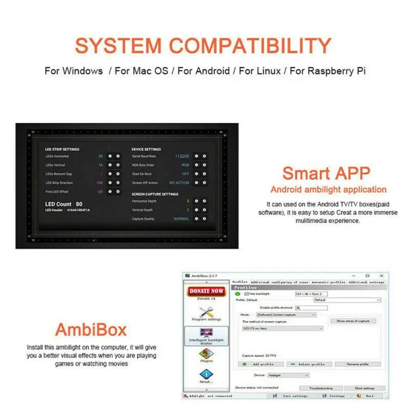 Продукт принимает WS2812 независимый точечный пиксельный светильник. В светильник источник может собрать цвет дисплей видео через контроллер сбора данных. Цвет экрана может переливаться, синхронизировать видео экрана и экран, а яркость и атмосфера можно регулировать через системное программное обеспечение. Он также поддерживает различные музыкальные режимы DIY персонализированные потребности