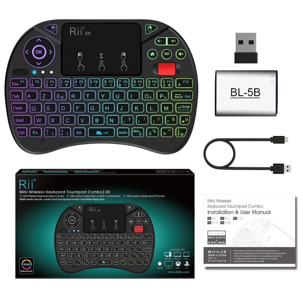 Оригинальный Rii X8 2,4 GHz AZERTY мини французская беспроводная клавиатура с тачпадом, изменяемый цвет со светодиодной подсветкой, литий-ионный аккумулятор