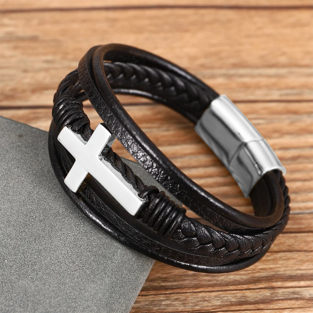 NameMulticolor Cross Design Classic Stainless Steel Men's Leather Bracelet