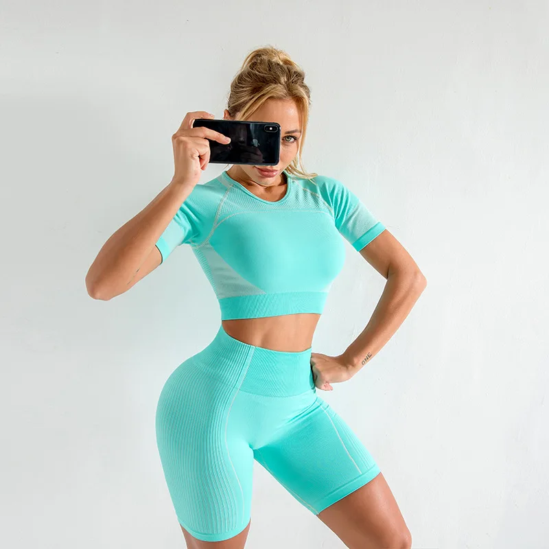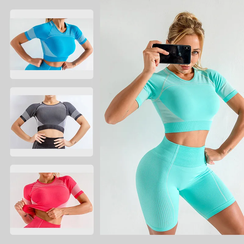 Бесшовные женские костюмы для йоги, тренажерного зала, тренировок, фитнеса, спортивные костюмы, топ с коротким рукавом, шорты с высокой талией, одежда для бега