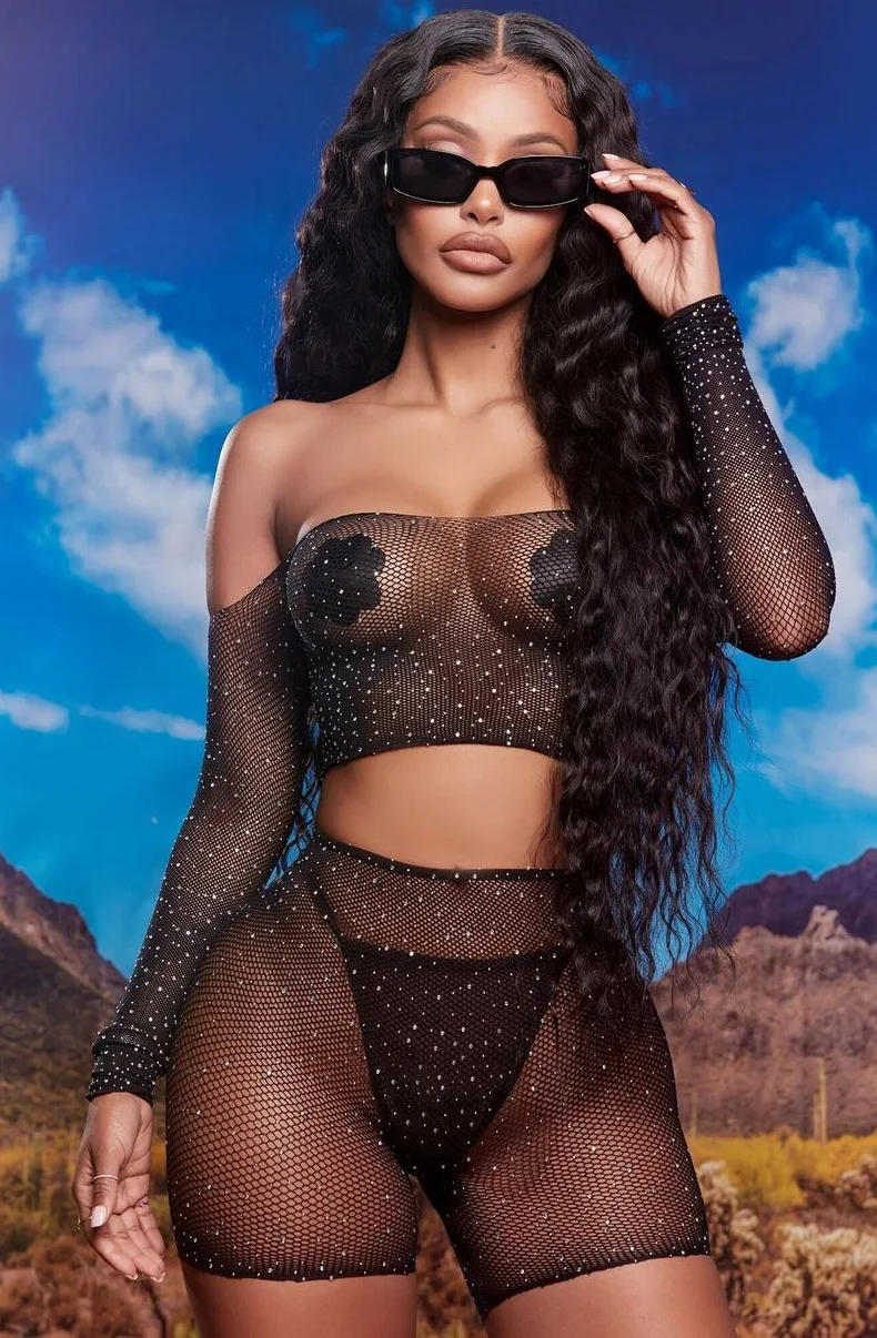 2021 Женский комплект 2 шт., новые осенние пикантные Клубные наряды с длинными рукавами укороченный топ с открытым плечом, детский комплект одежды, топ и шорты бриллиантами сетки комплект из двух предметов
