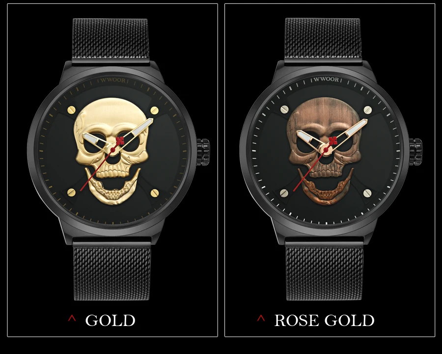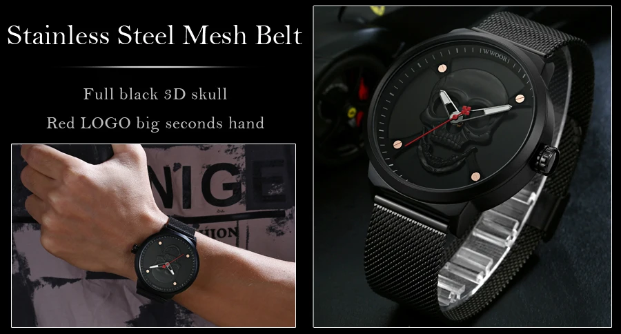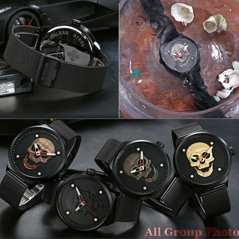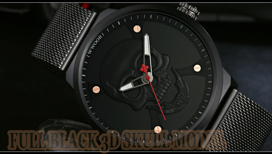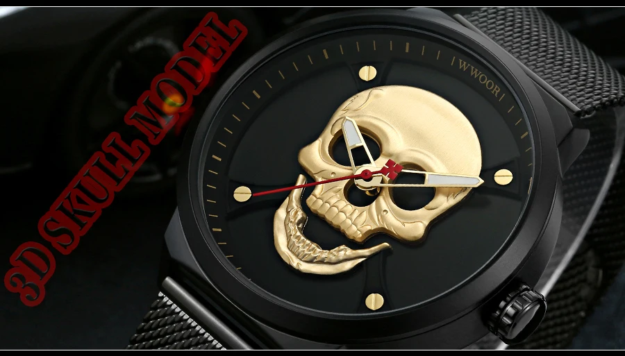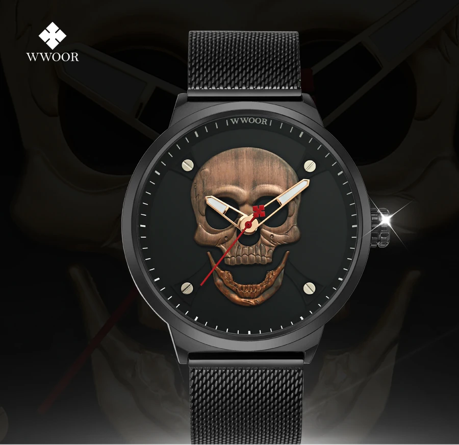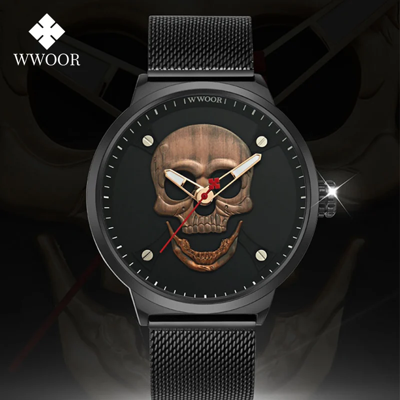 Часы WWOOR Мужские кварцевые со стальным сетчатым браслетом, креативные стильные брендовые Роскошные с рисунком черепа