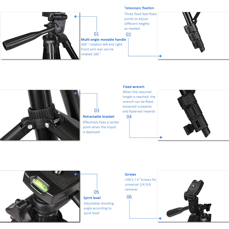 2. Трехмерная панорамная/наклонная головка, соединительная резьба используется на международном уровне M1 / 4 ", подходит как для традиционных камер, цифровых камер, так и для небольших видеокамер