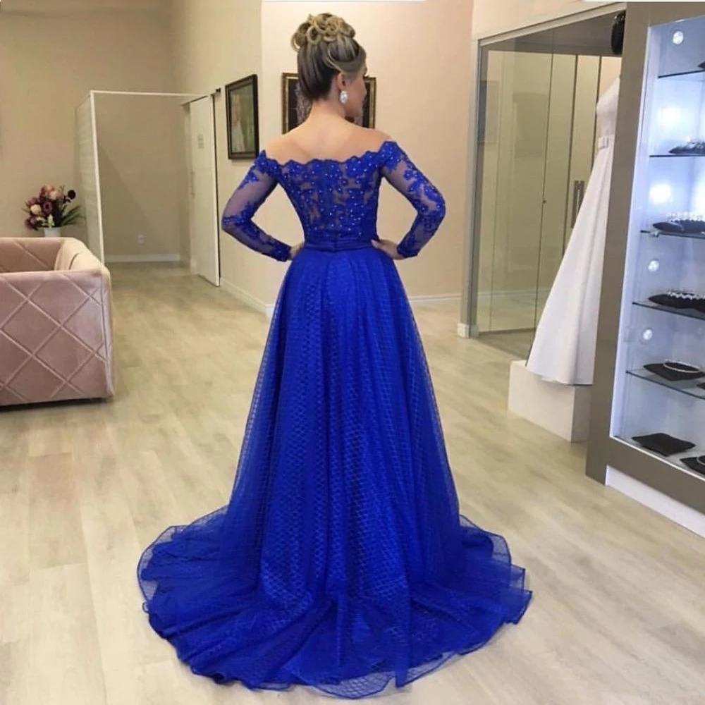 Королевский синий кружевное платье для мамы; Обувь под свадебное платье для невесты с длинным рукавом с открытыми плечами Кристаллы Вечерние Свадебная вечеринка платья, для торжественных событий