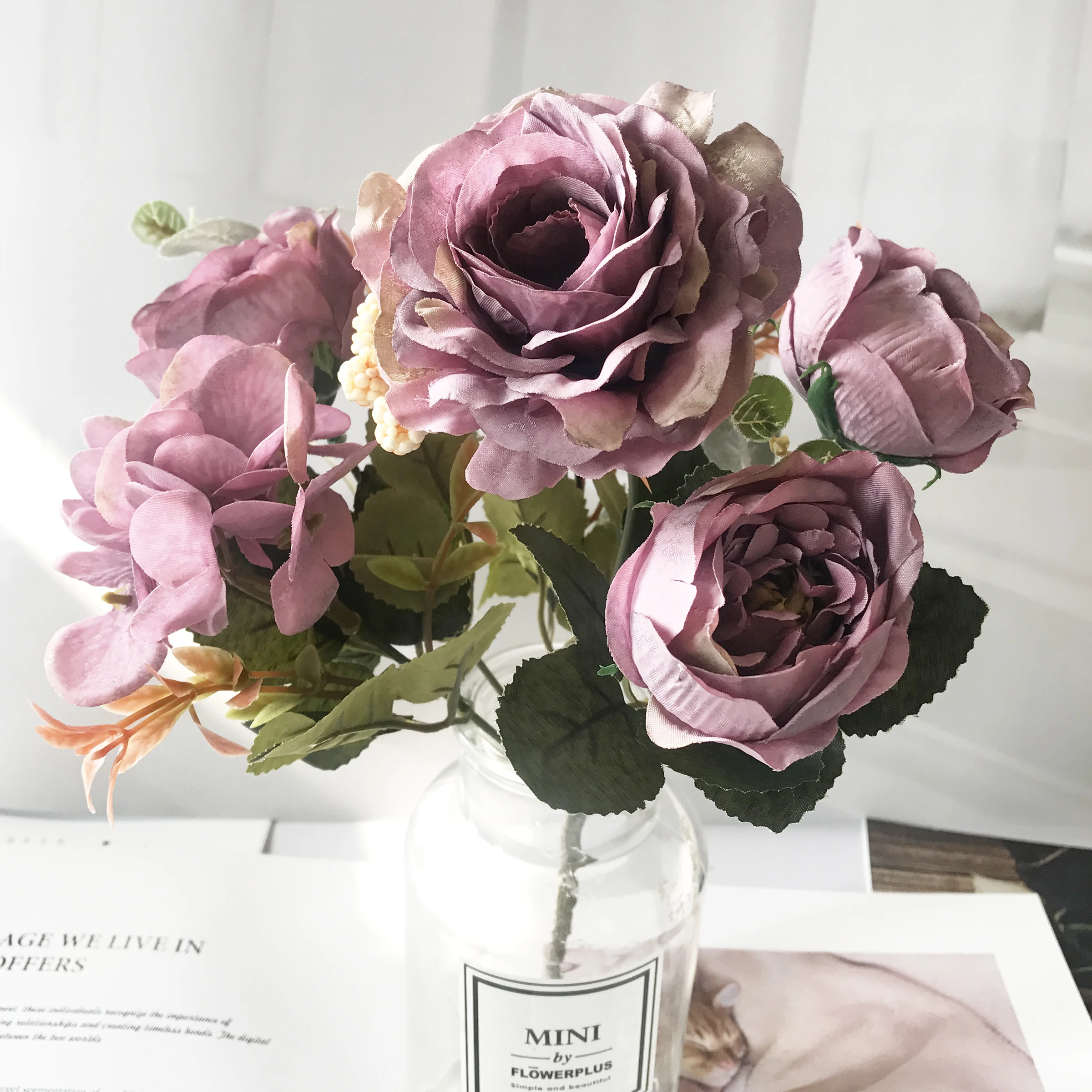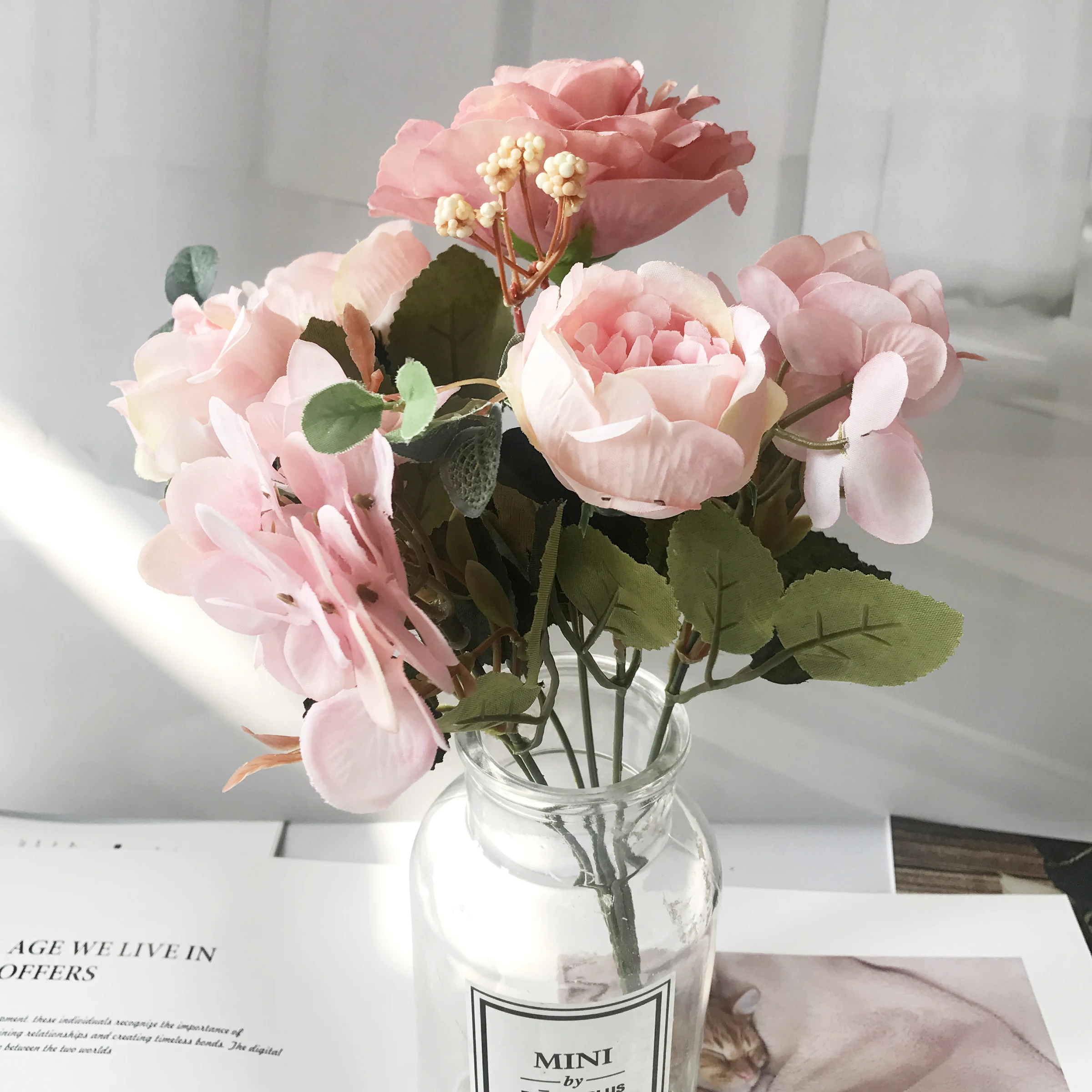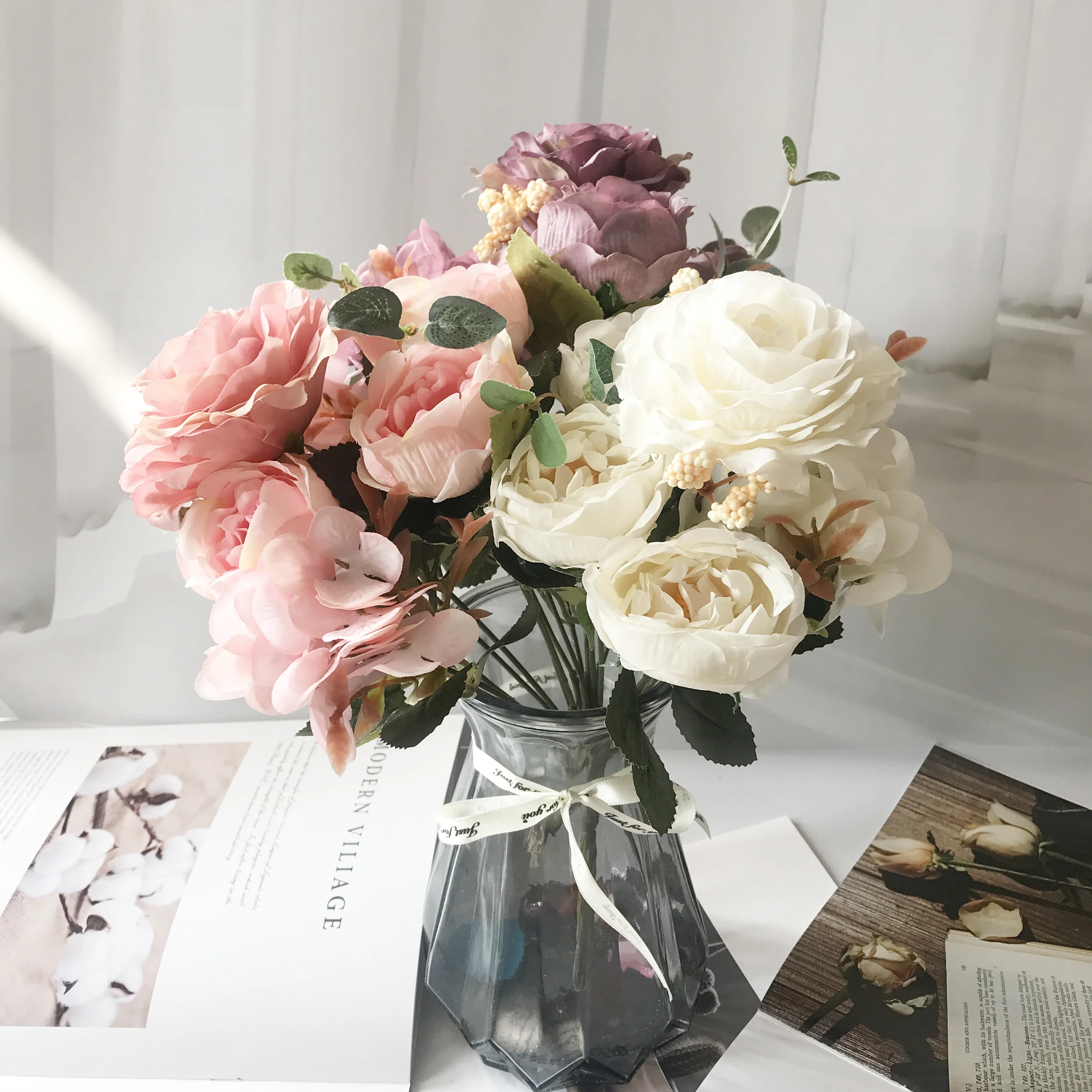Искусственные цветы ретро букет роз из шелка Гортензия пион Винтаж Невеста держит поддельный цветок Домашний Свадебные украшения, аксессуары