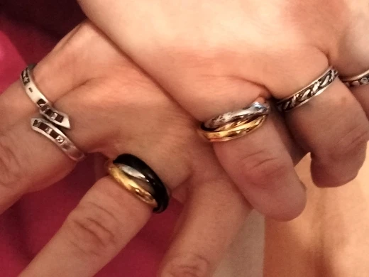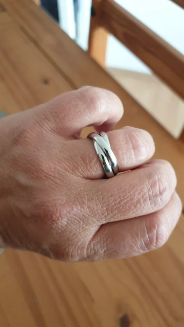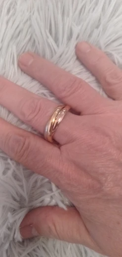 Я не могу рекомендовать это кольцо. Он разработан на традиционном русском дизайне свадебных колец, но они обрезали каждое кольцо, чтобы соединить с тремя комплектами, и заметный вырез в браслете.