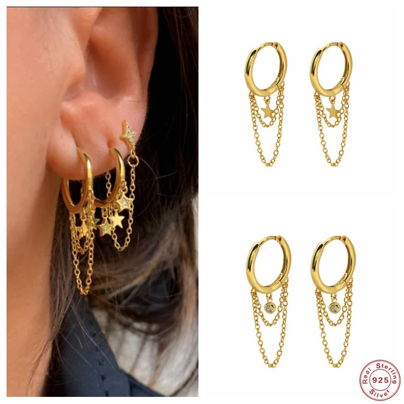 Женские серьги-кольца из стерлингового серебра 925 пробы с маленькими звездами и бусинами для девочек, круглые серьги-цепочки с кисточками, ювелирные украшения для вечеринок