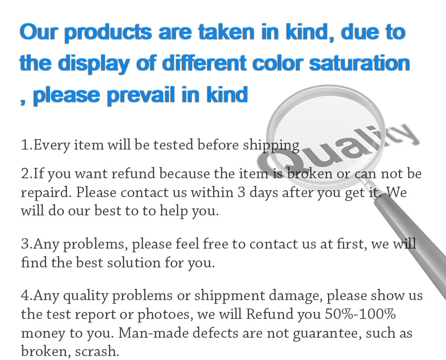 Пожалуйста, укажите ваше полное имя (первое, среднее и фамилию) и правильный адрес (номер квартиры, улица, город, регион и страна) при размещении заказа. Наша цель-сделать повседневную жизнь людей намного проще. Мы стремимся предоставлять высококачественную продукцию и лучшие услуги для наших клиентов. Каждый наш покупатель будет настолько доволен мнение счетчики. Мы хотим, чтобы услышать ваш голос. Мы хотим видеть улыбку, когда вы получаете продукты. Мы хотим убедиться, что вы удовлетворены. Вы можете доверять нам.