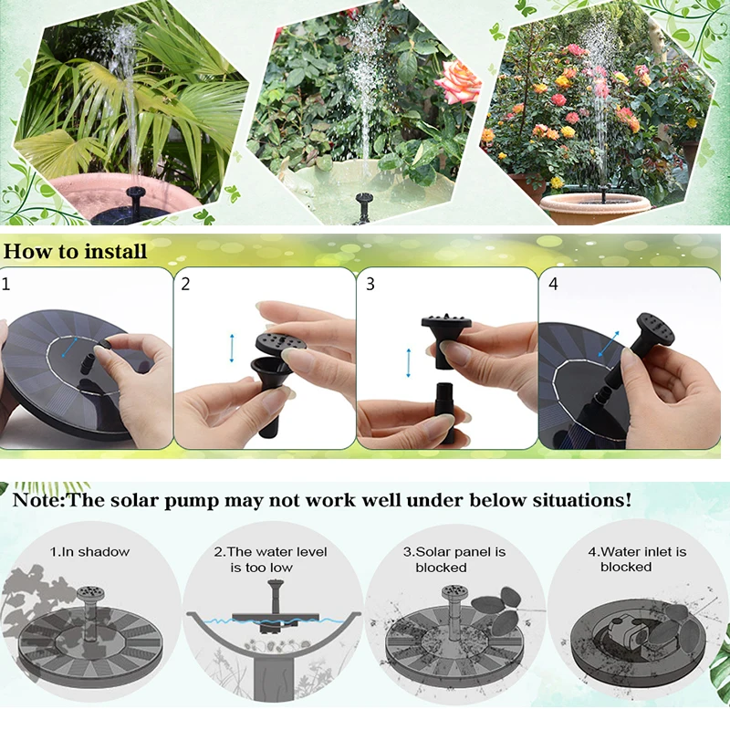 1. Перед использованием продукта, защитная пленка на солнечной панели должна быть удалена, чтобы избежать воздействия на нормальную работу продукта. 2. Убедитесь, что вся солнечная панель находится прямо на солнце! Насос не может работать под тенью или облаком. 3. Бассейн должен иметь достаточно воды, чтобы убедиться, что насос полностью погружен в воду. 4. Регулярно очищайте насос и панель. Убедитесь, что ничто не покрывает любую часть солнечной панели или не блокирует насос. 5. Мощность солнечной панели зависит от солнечного света, поэтому насос зависит от погоды, сезонов и мест и т. д. 6. Не заставляйте насос работать без воды в течение длительного времени, в противном случае срок его службы сократится. 7. Если вы обнаружите, что спрей для воды заблокирован, вы можете удалить насос для очистки.