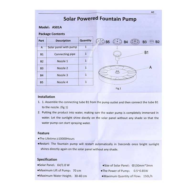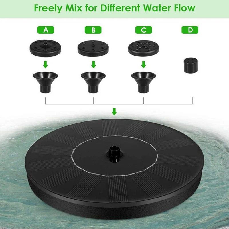 1) солнечная панель: 7 В/1 Вт 2) Выходное напряжение насоса: 7 В постоянного тока 3) Максимальная емкость насоса: 180 л/ч 4) Максимальная высота откачки: 60 см 5) Без аккумулятора 6) Диаметр: 13 см