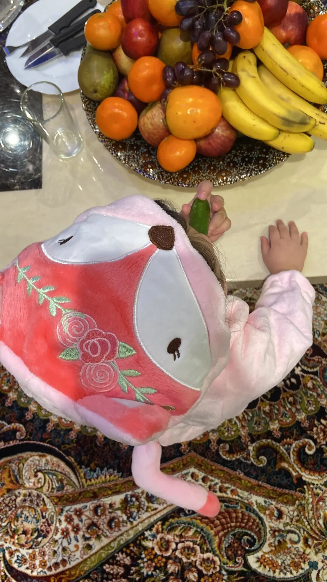 Продавец отправил в последний дел, но при этом заказ доехал очень быстро, буквально за неделю после отправки. Ребёнку 1.5 года, рост 86, взяли на 3 года для запаса. Цвет намного беднее, чем у продавца, молния рабочая, хорошая. Похож на приятный плед, ребёнку тактильно нравиться. Хвост ходить не мешает, работе молнии тоже. Морда очень симпатичная у костюма.