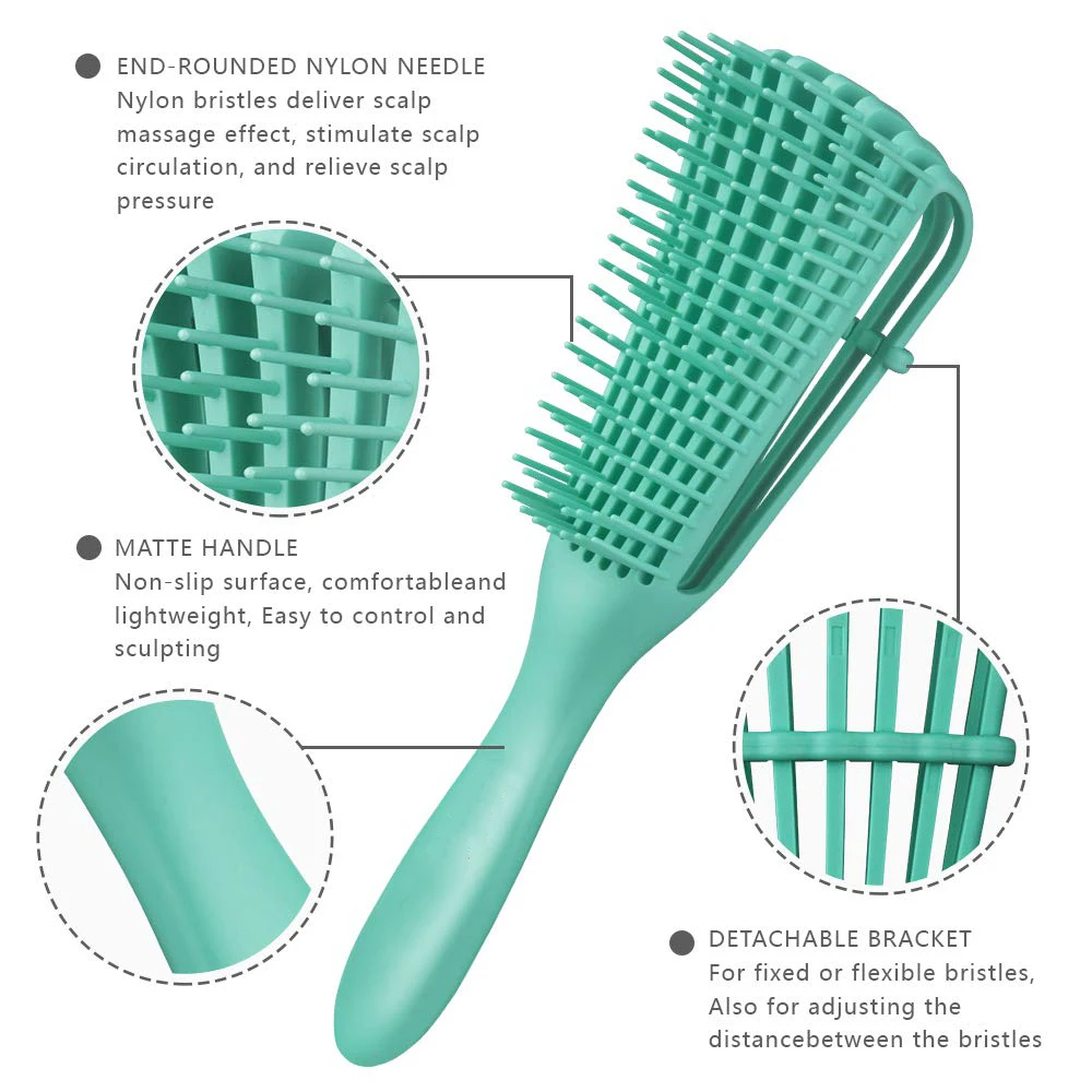 Легкая облегчающая Расчесывание Волос Гибкие насадки-щетки с разделенными щетинками специально разработаны для распутывания вьющихся, волнистых, кудрявых или нормальных волос без повреждения. Для волос Super Coily/ Kinky Особенно идеально подходит для типов волос 3A-4C (Coily/kinky hair) и тех, у кого очень запутанные волосы. Также подходит для любого типа волос. Для влажного и сухого распутывания Подходит как для влажных, так и для сухих волос. Можно использовать как повседневную щетку для волос. Для улучшения ухода за волосами Используйте щетку, когда вы моете волосы, чтобы удалить запутывания во время массажа и очистки кожи головы. Удобно лежит в руке Нескользящая резиновая рукоятка обеспечивает комфортное и точное управление.