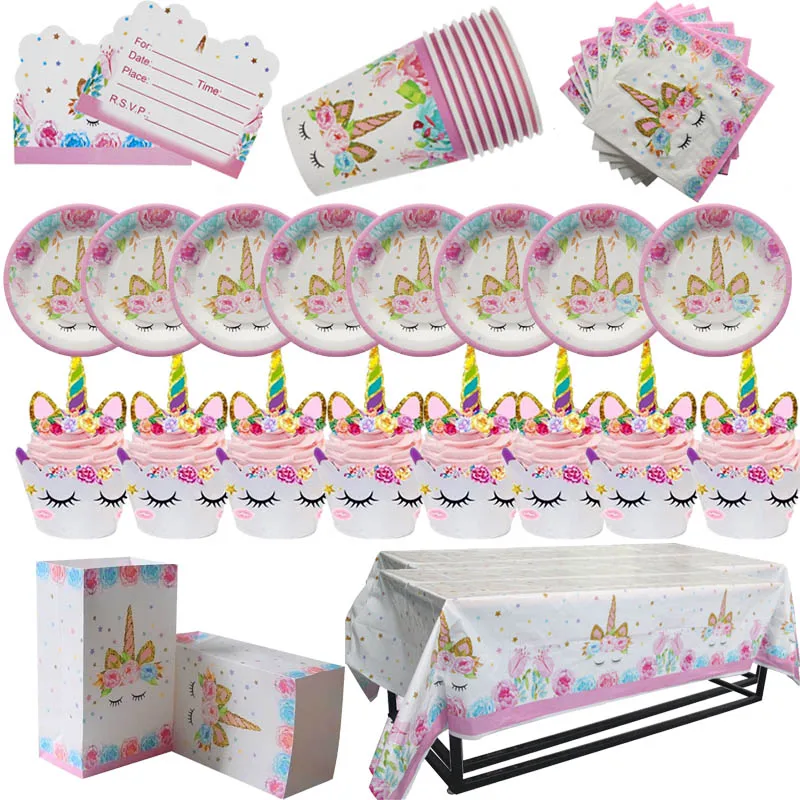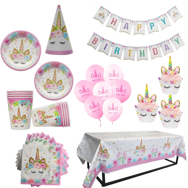 Единорог день рождения принадлежности одноразовый набор столовых приборов Единорог шар кружки, тарелки, салфетки Дети День рождения 1st Детские душевые декорации