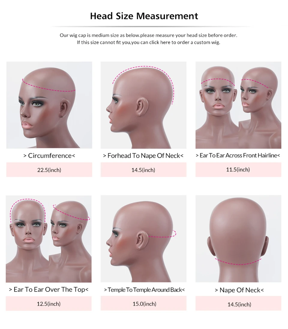 Наша крышка парика среднего размера, как показано ниже.Пожалуйста, измерьте размер головы перед заказом.Если этот размер вам не подходит, нажмите здесь, чтобы заказать пользовательские парики.