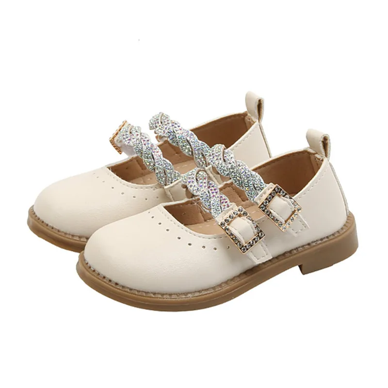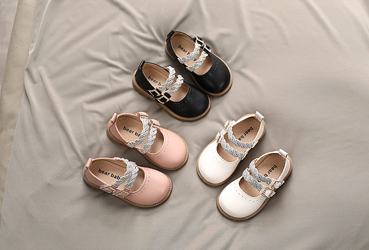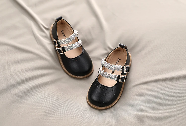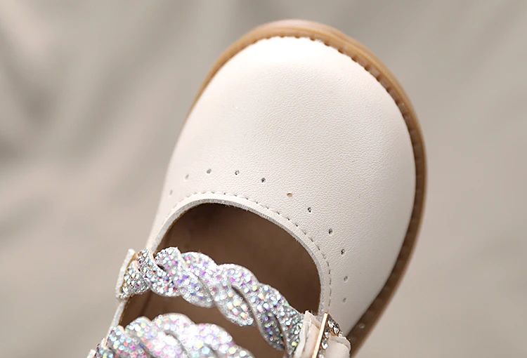 2021 Весенние новые кожаные туфли для девочек детские туфли принцессы на плоской подошве со стразами черные белые розовые мягкие танцевальные туфли E484