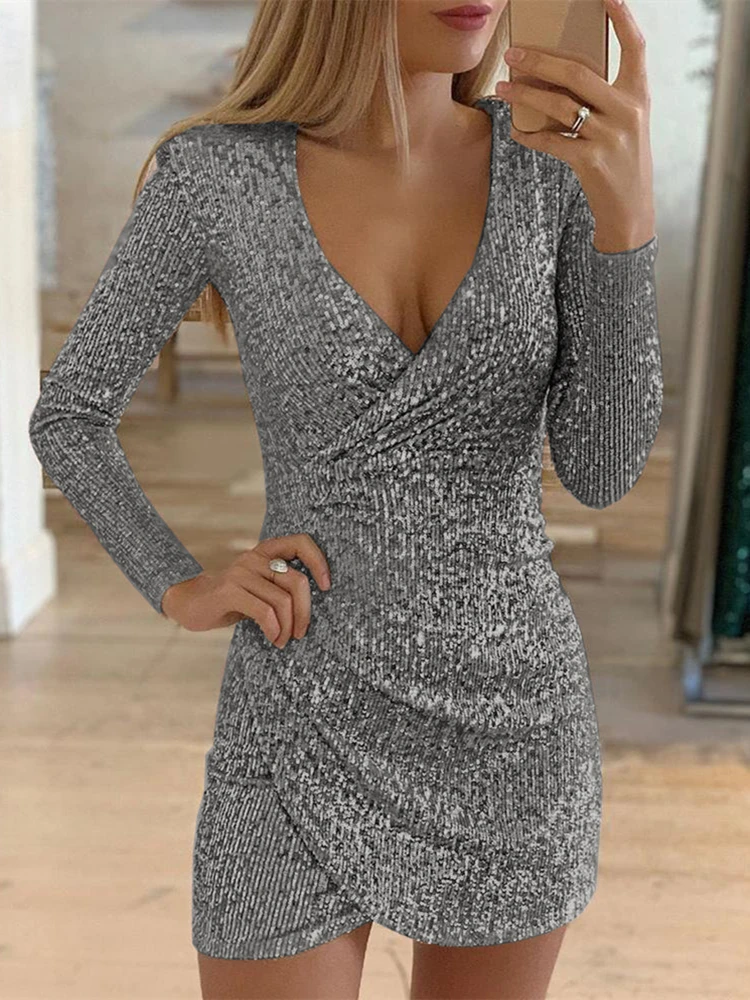 Женское блестящее облегающее мини-платье с V-образным вырезом