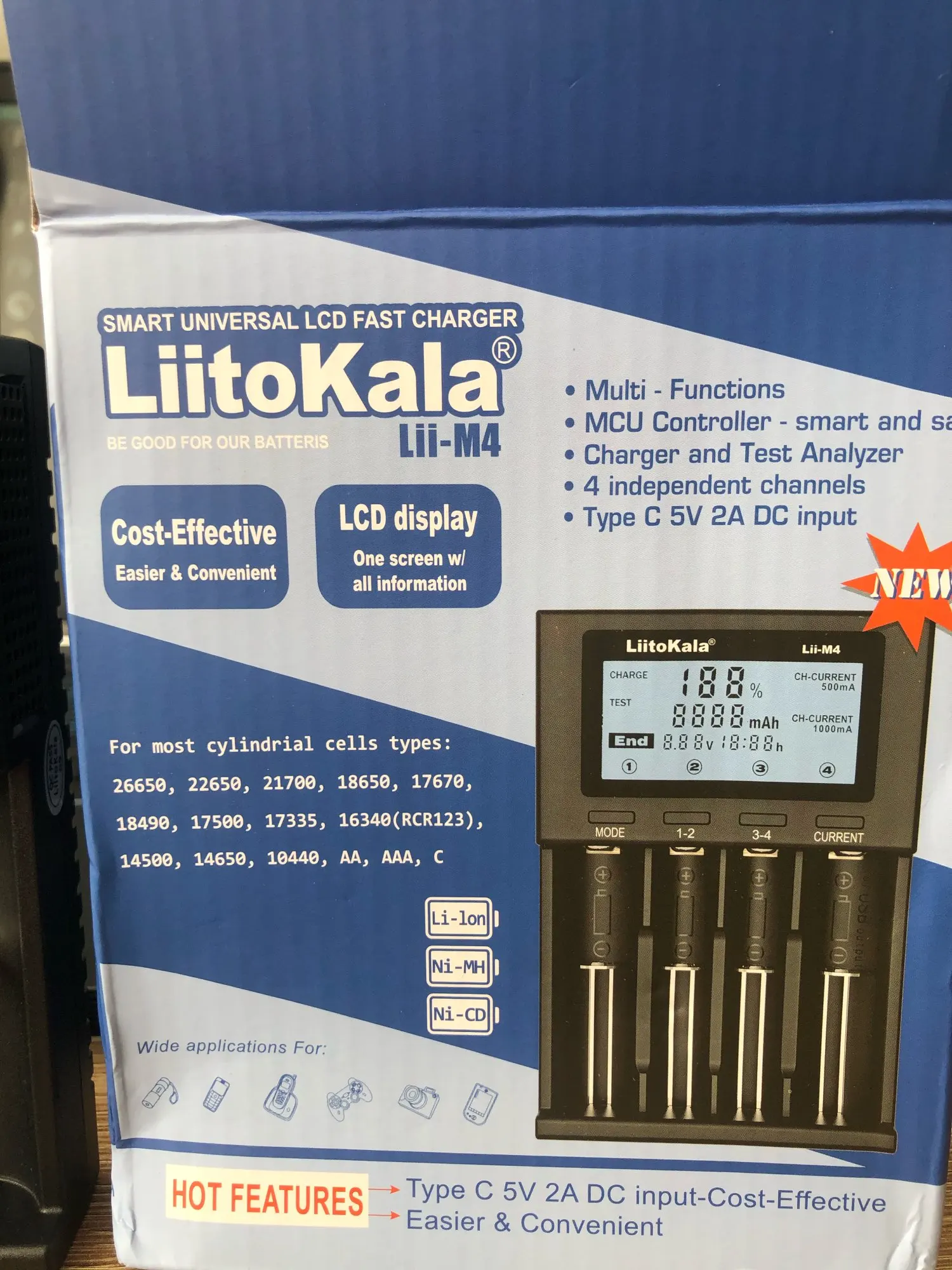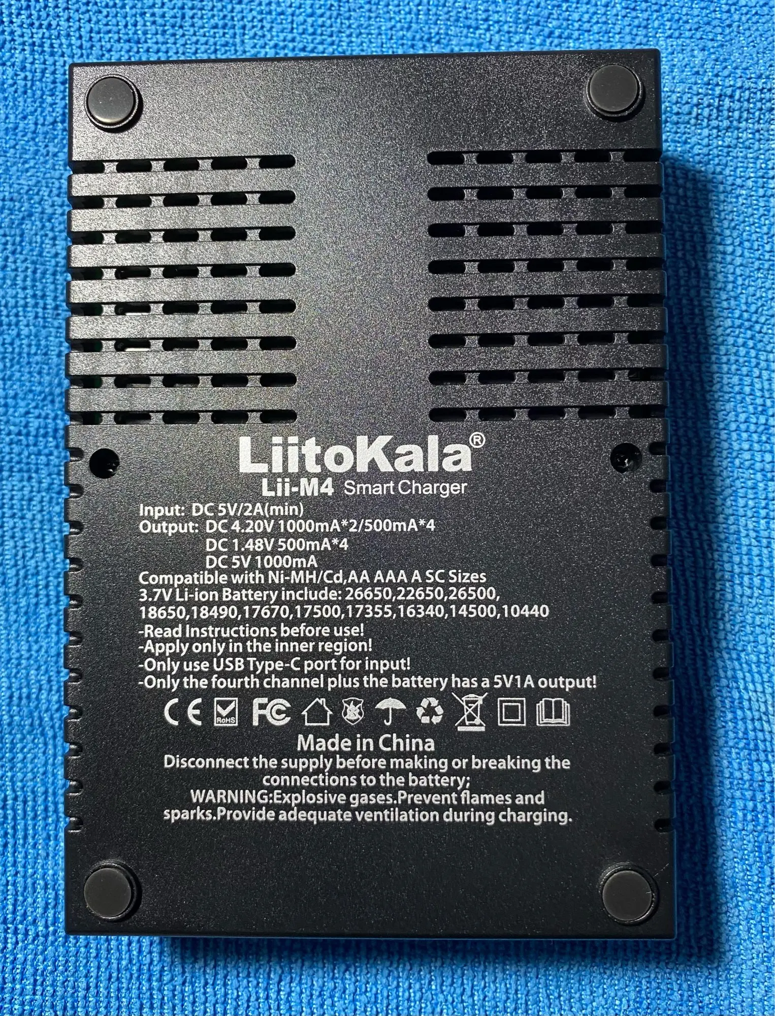 Бренд: LiitoKala Модель: Lii-M4Входное напряжение: 5 В/2 а постоянного токаВыход напряжение: DC 4,2 V / DC 1,48 V/3,65 V DC/DC 4,35 V / 5VЛитиевая батарея выходного токаТок зарядки: 500мА * 4/1000мА * 2 NiMH батареяТок зарядки: 500мА * 4 USB 5 в выходной ток: 1000 мА аккумуляторная батарея характеристики: 26650,21700,18650,18350, 20650,14500, AA, AAA, C,SC и т. д. метод прерывания: Интеллектуальный контроль напряженияРазмеры: 146 мм (длина) * 100 мм (ширина) * 33 мм (высота).