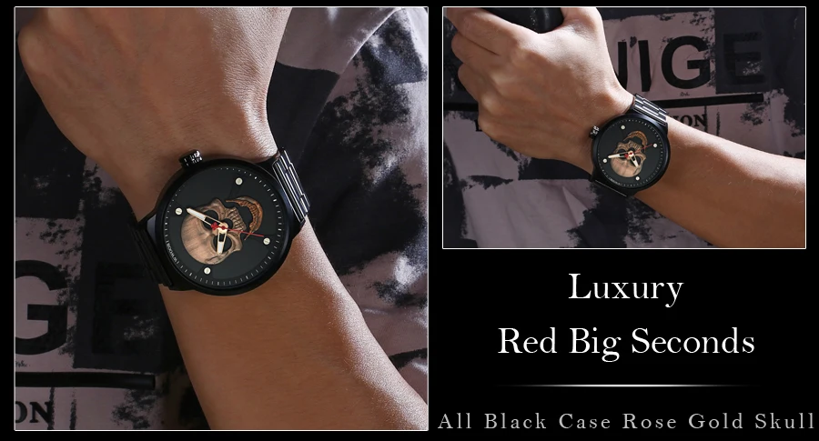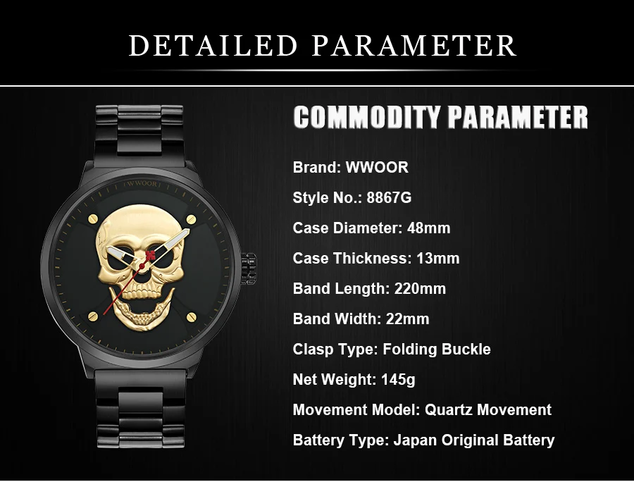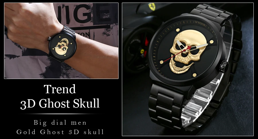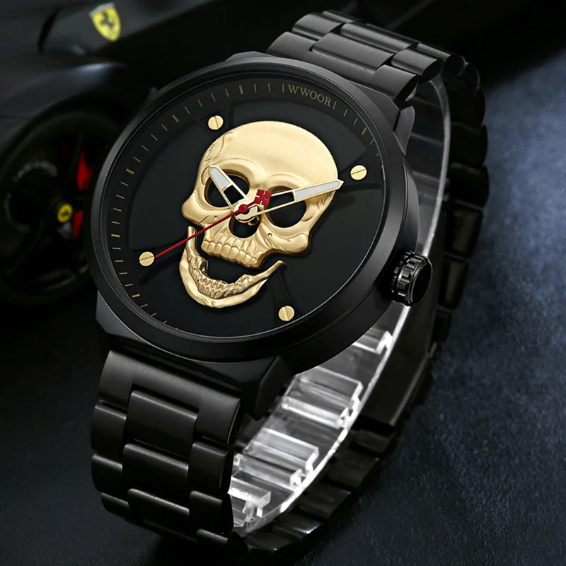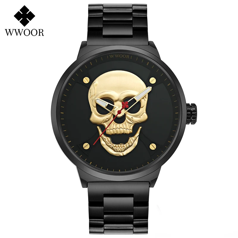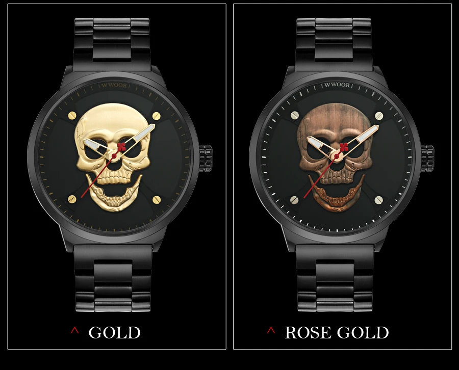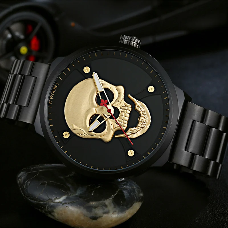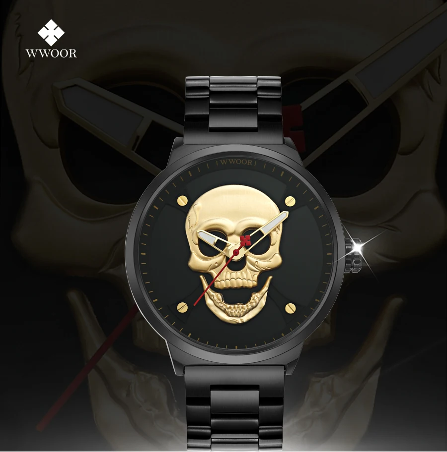 WWOOR мужские модные повседневные часы, креативные кварцевые часы из нержавеющей стали, лучший бренд, Роскошные наручные часы с золотым черепом, мужские часы