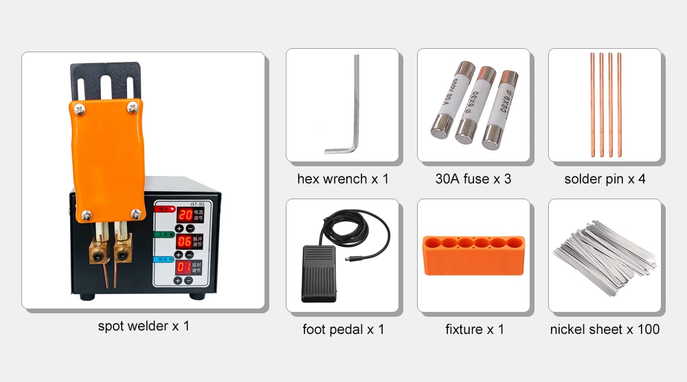 Ножная педаль x 1 приспособление x 1 никелевый лист x 100 шестигранный ключ x 1 30A предохранитель x 3 припоя контактный x 4