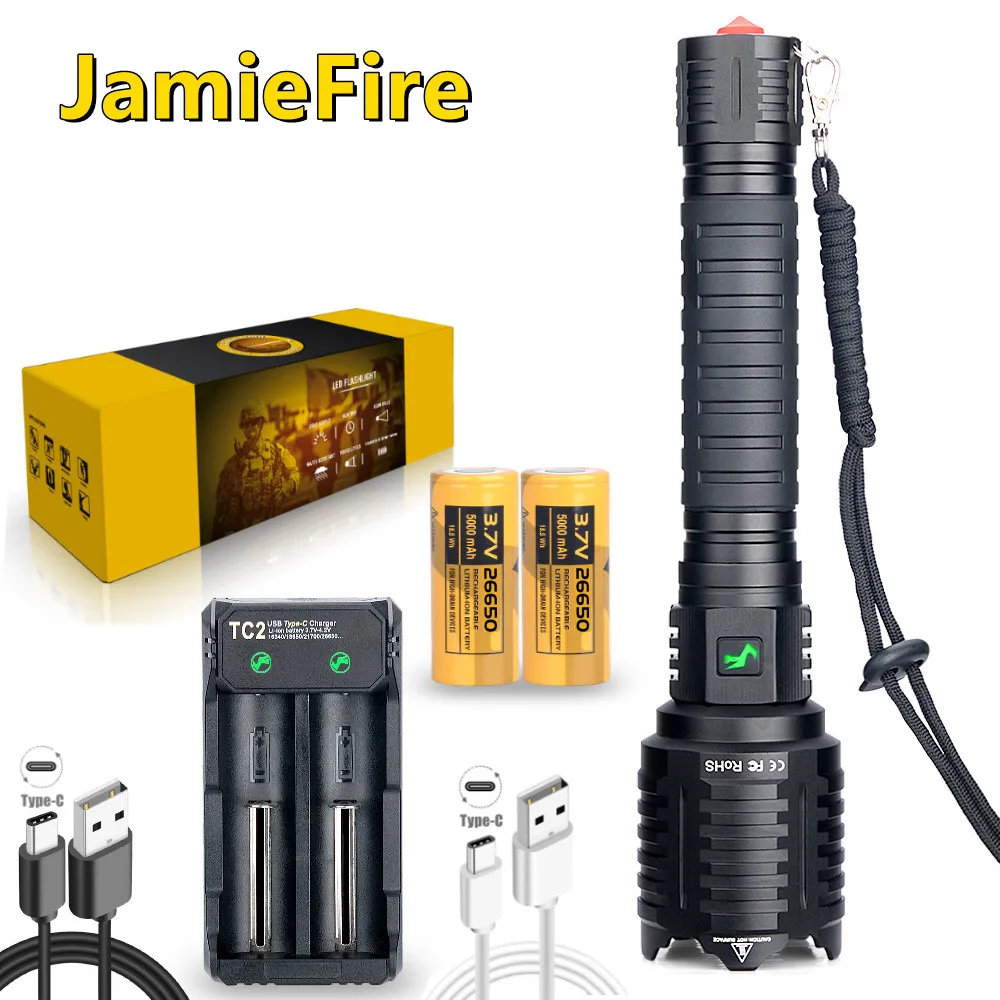 JamieFire LED Вспышка мощный фонарь яркий фонарь тактический охотничий масштабируемый 26650 Кемпинг USB Перезаряжаемый фонарь