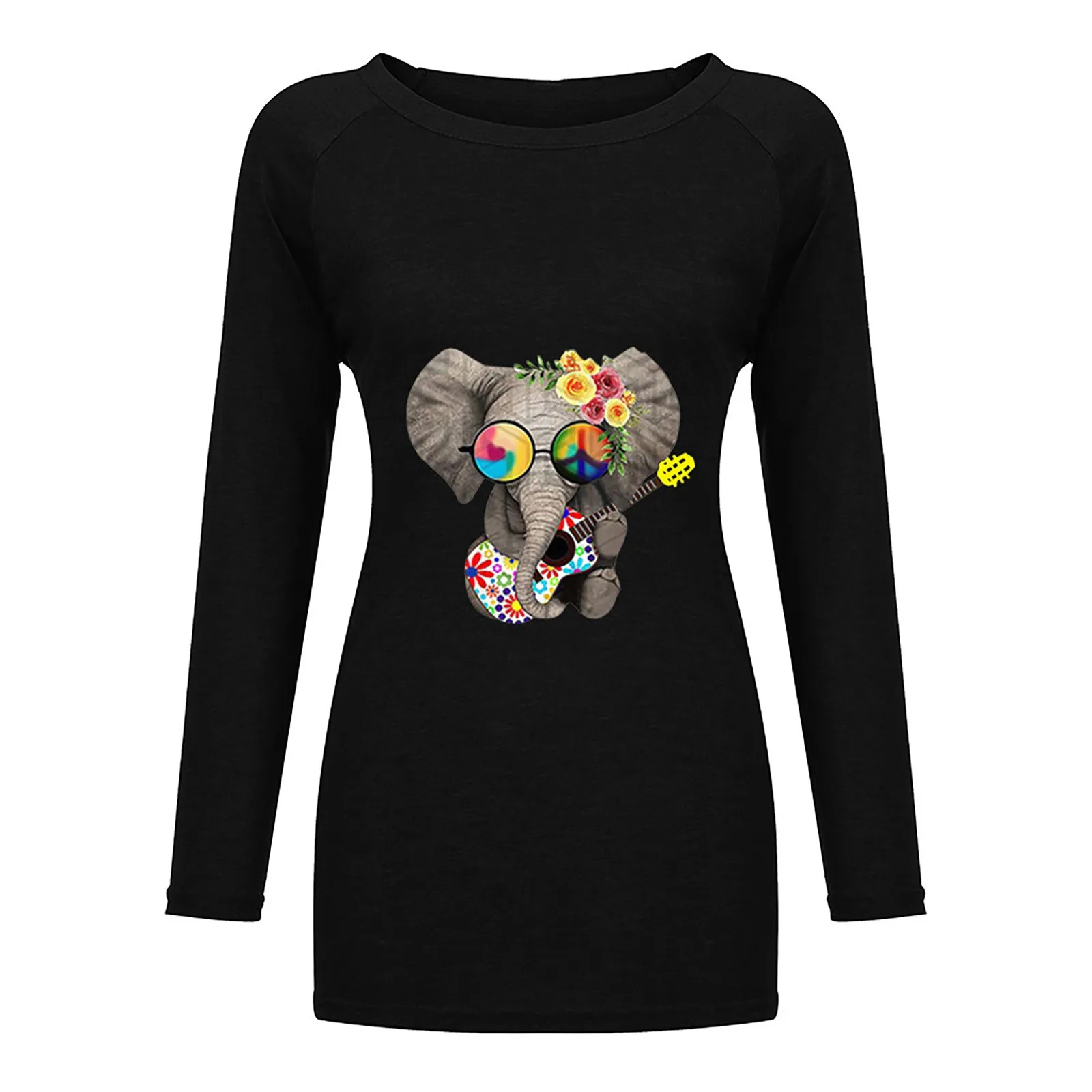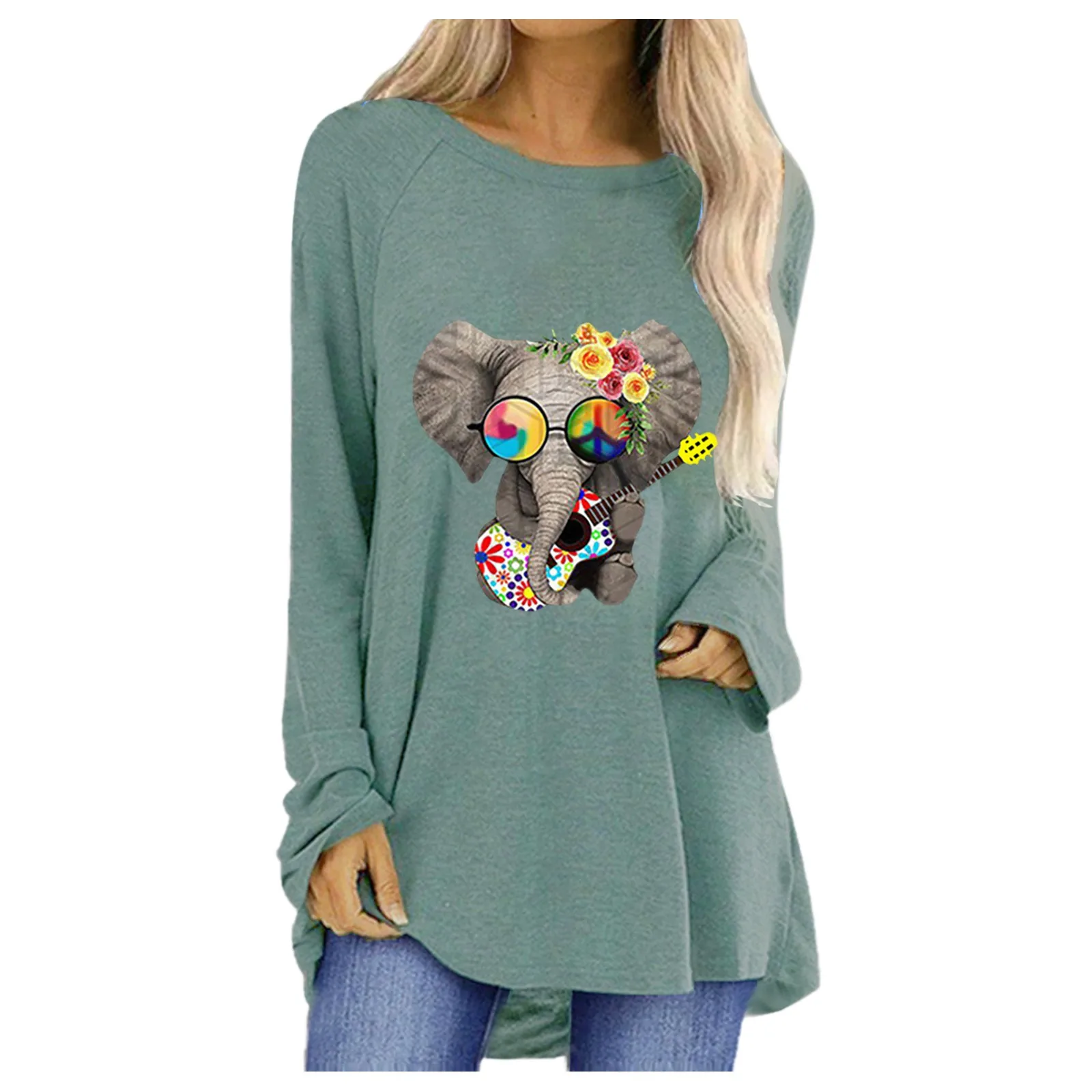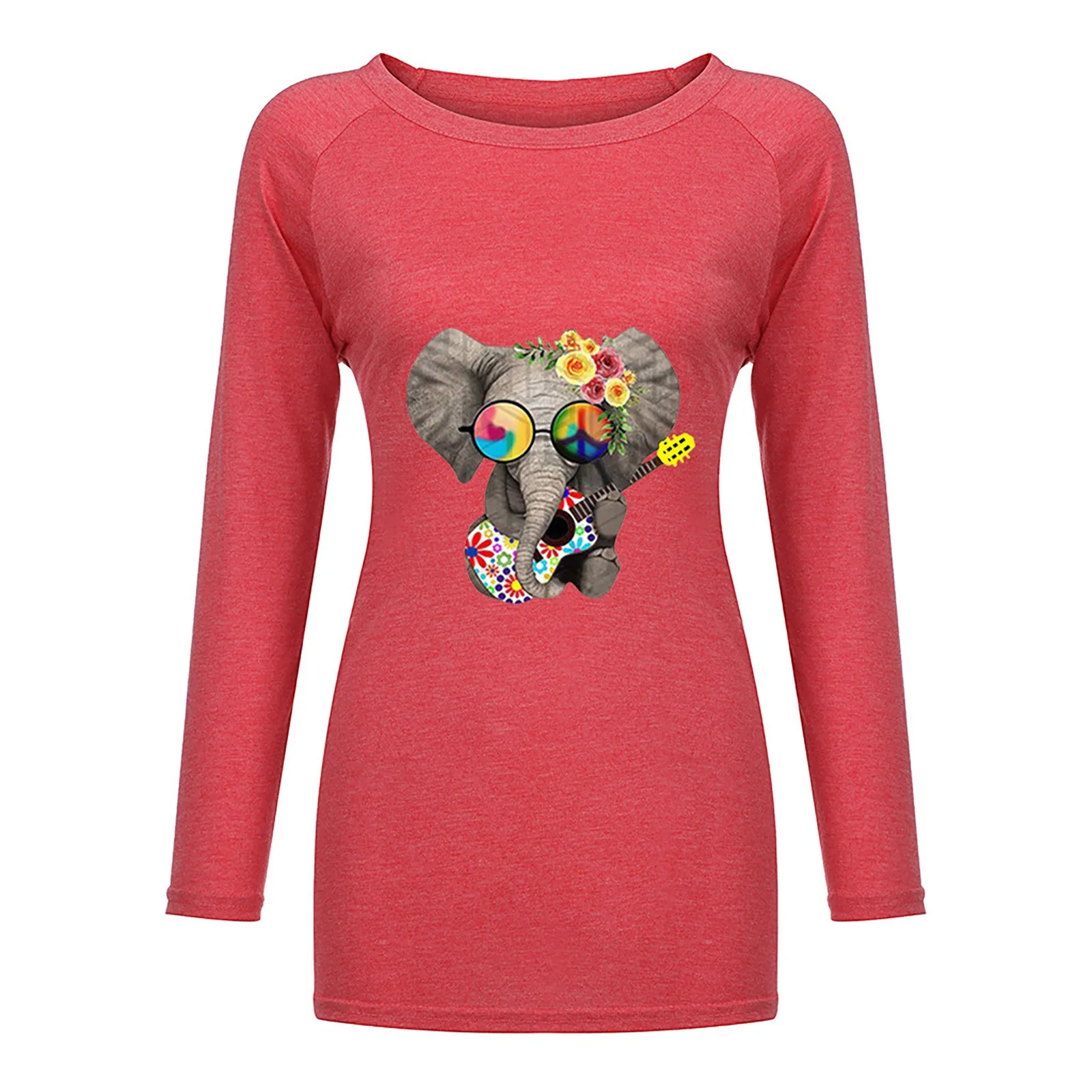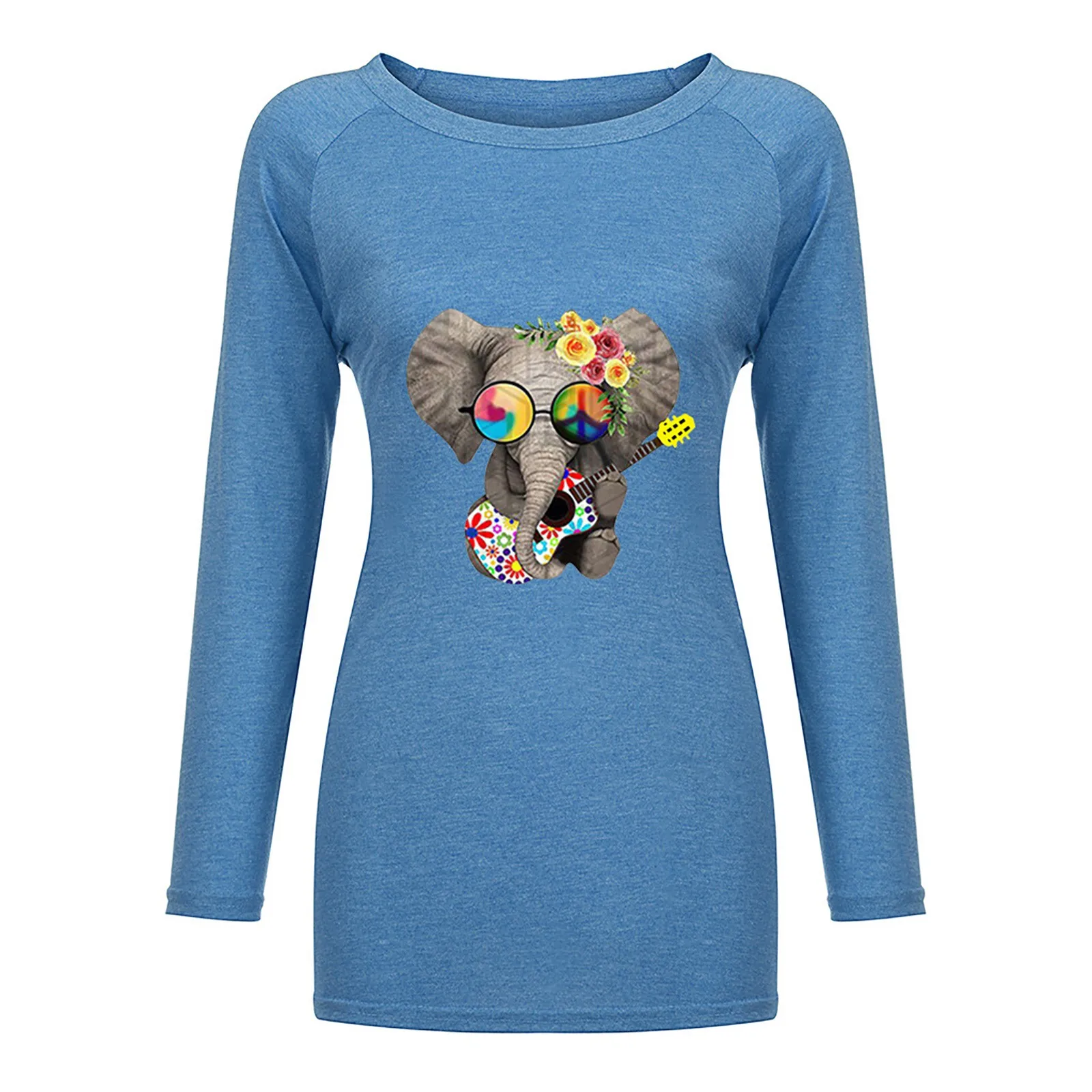 Женская футболка с принтом в виде слона, 40 #, Весенняя Свободная Повседневная футболка с длинным рукавом и круглым вырезом, модные Футболки Оверсайс