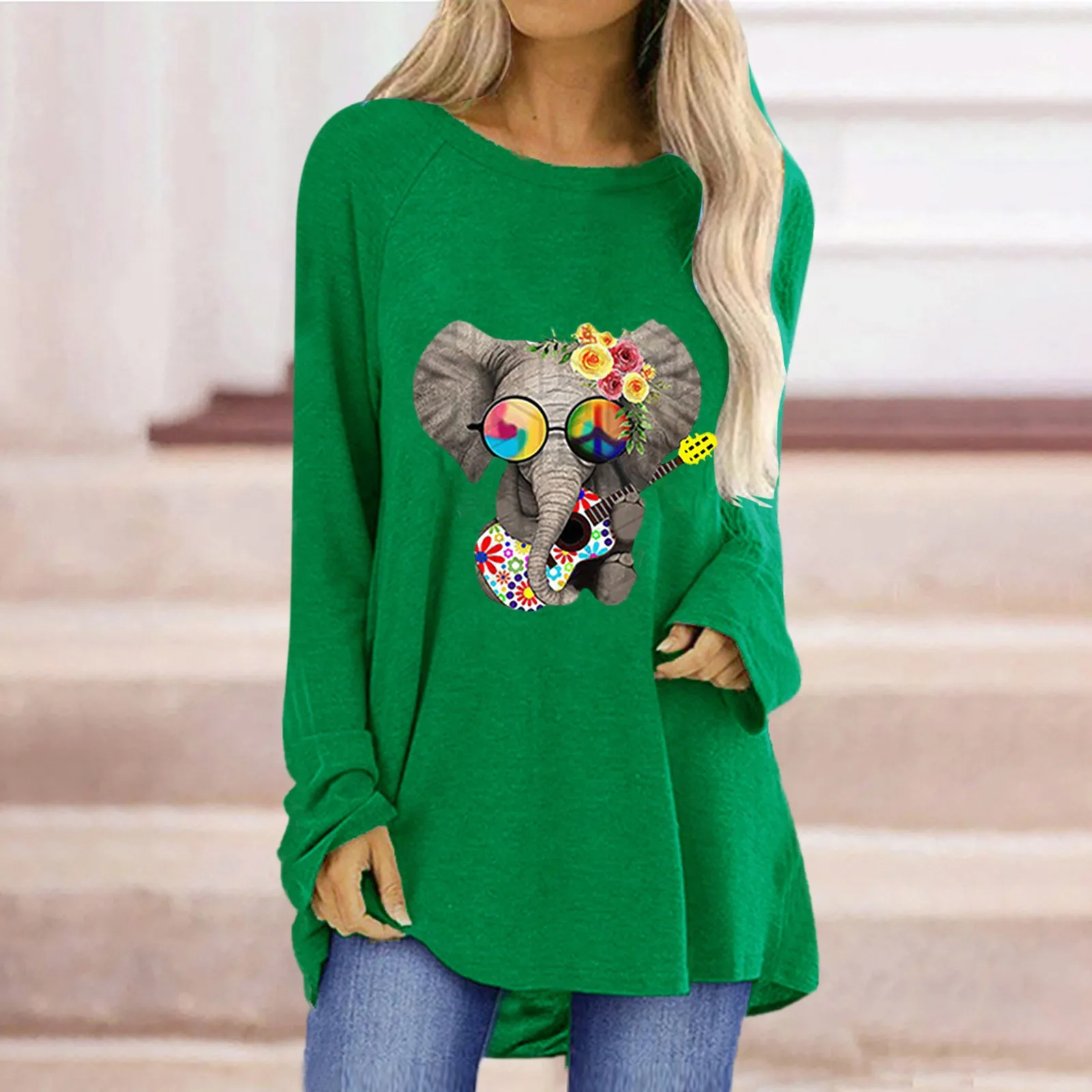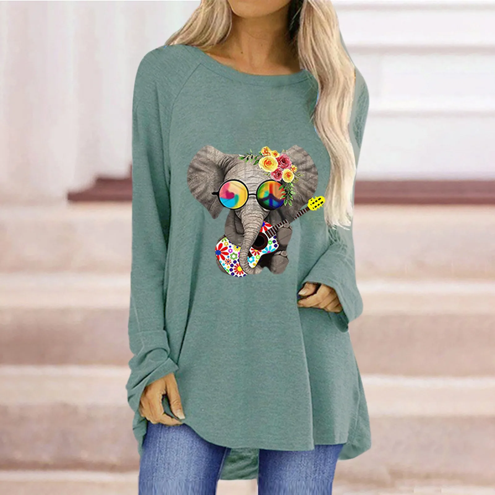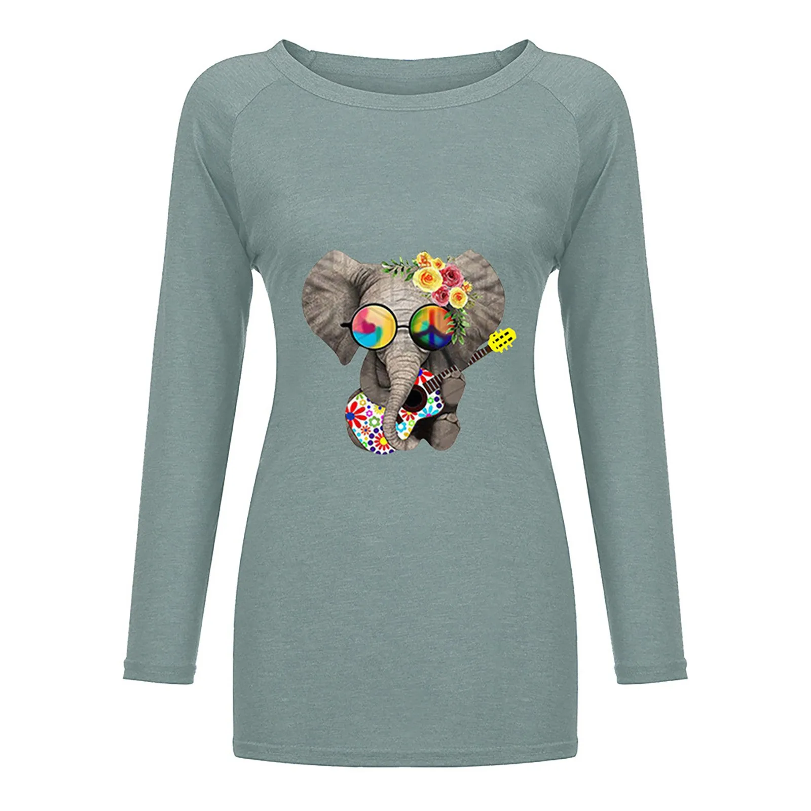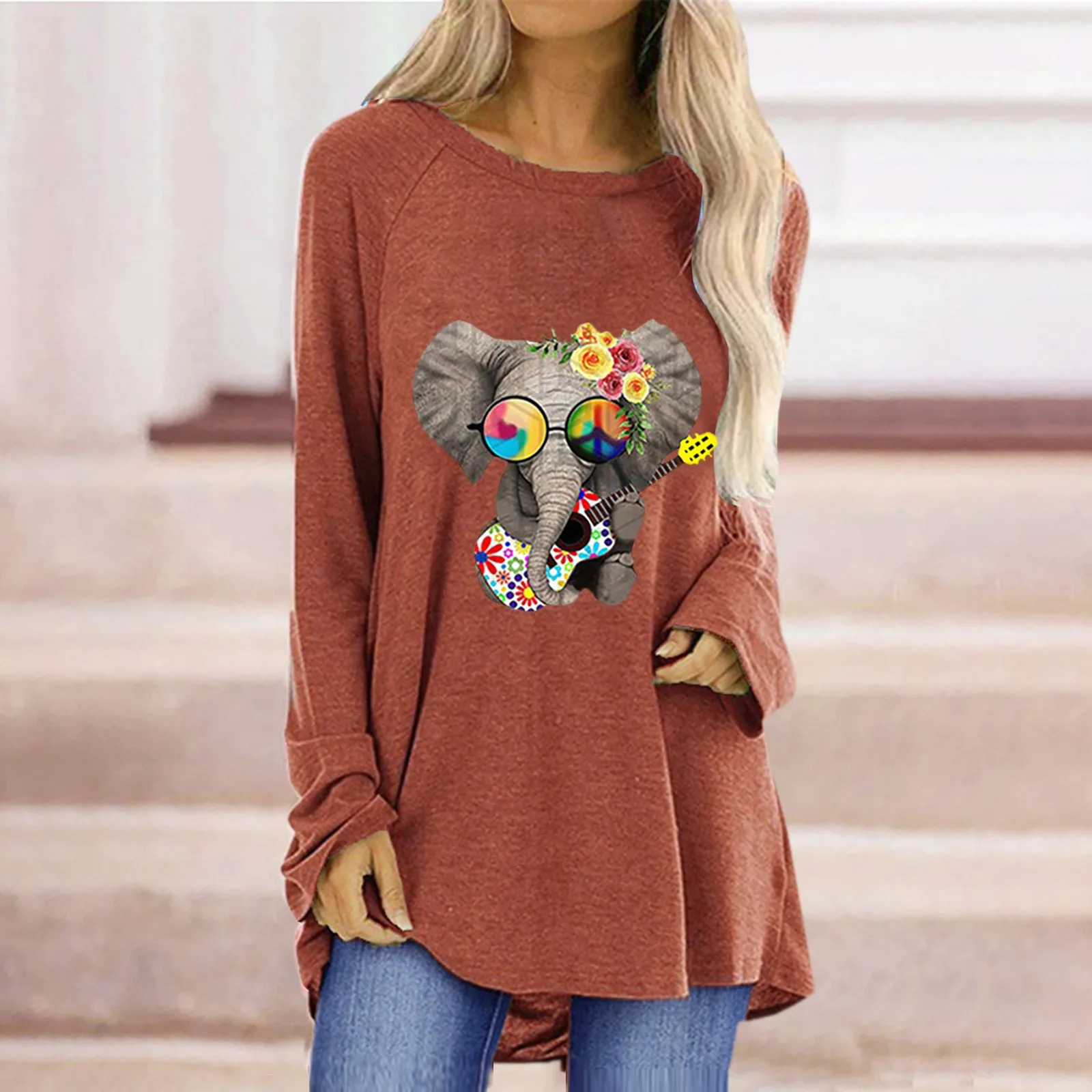 Женская футболка с принтом в виде слона, 40 #, Весенняя Свободная Повседневная футболка с длинным рукавом и круглым вырезом, модные Футболки Оверсайс