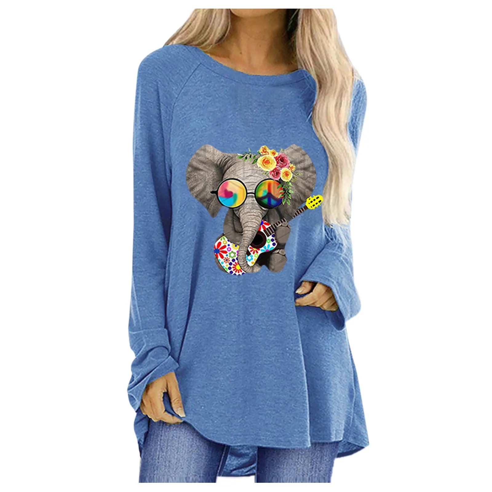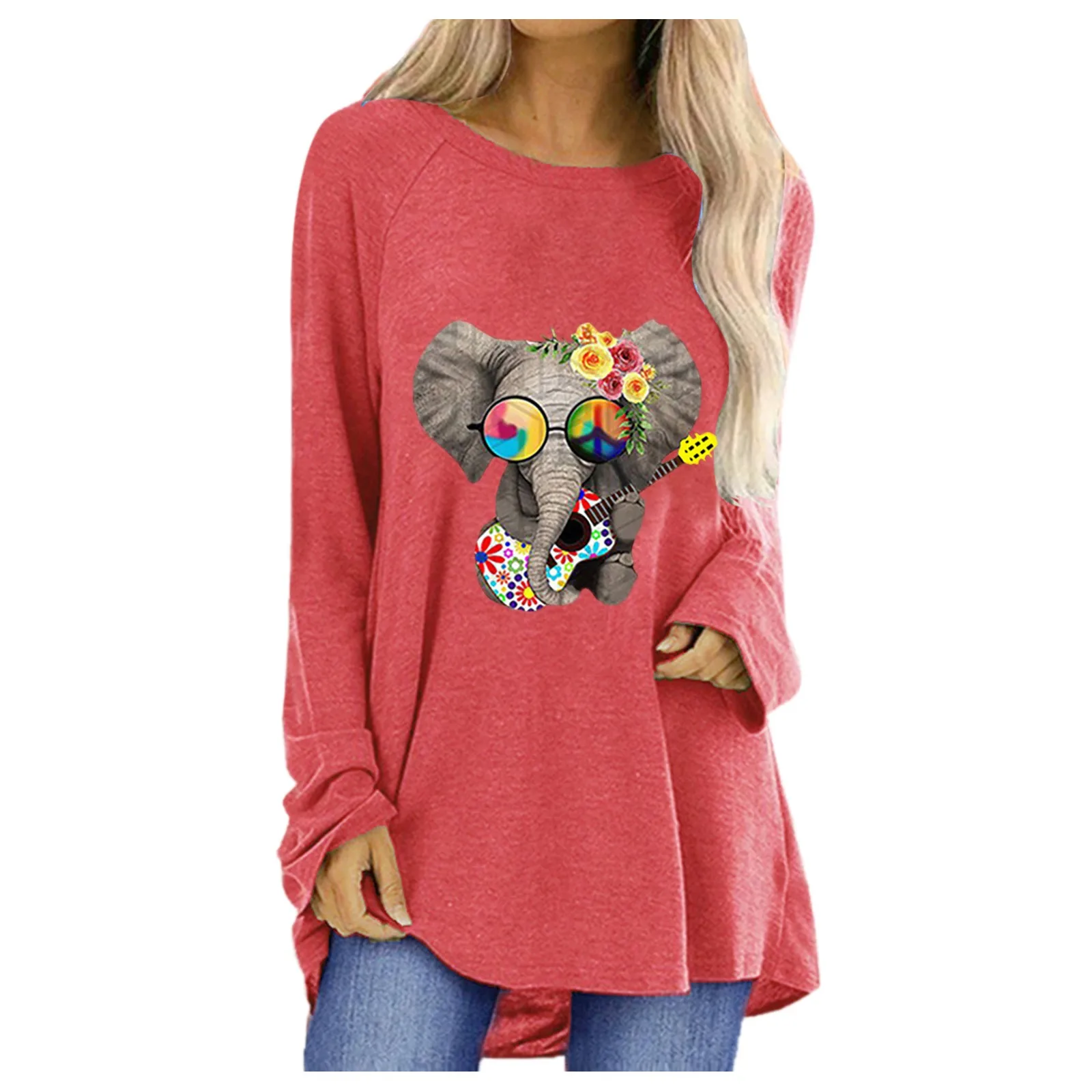 Модная женская футболка с принтом слона и длинным рукавом, свободная футболка с круглым вырезом, топ, блузка