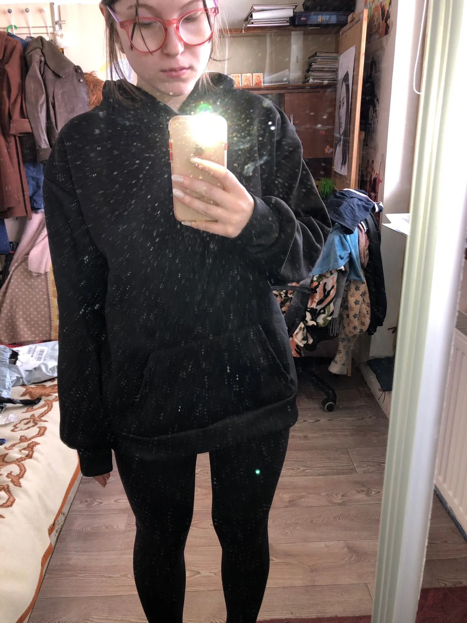 Ткань толстовки тёплая с начесом тянется хорошо , но тонкая, чёрная майка просвечивает через неё. Немного не то, что ожидала