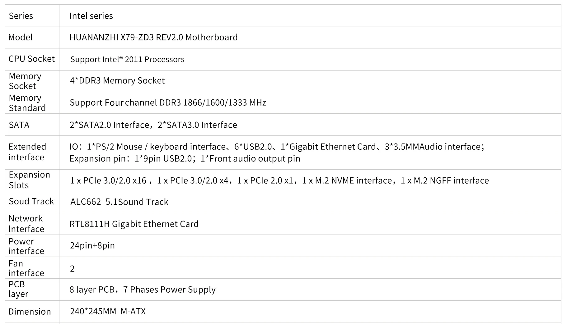 Модель: материнская плата HUANANZHI X79-ZD3 REV2.0Разъем ЦП: Поддержка процессоров Intel 2011Разъем памяти: 4 разъема памяти DDR3Стандарт памяти: поддержка четырехканальной DDR3 1866/1600/1333 МГцSATA: интерфейс 2 * SATA2.0, интерфейс 2 * SATA3.0Расширенный интерфейс: IO: 1 * PS/2 интерфейс мыши/клавиатуры, 6 * USB2.0, 1 * гигабитная карта Ethernet, 3*3,5 мм аудио интерфейс;Слоты расширения: 10: 1 * PS/2 интерфейс мыши/клавиатуры, 6 * USB2.0, 1 * гигабитная карта Ethernet, 3*3,5 мм аудио интерфейс;Расширительный контакт: 1*9 контактов USB2.0; 1 * передний аудиовыходДорожка Soud: 1x PCle 3,0/2,0x16 , 1 x PCle 3,0/2,0x4, 1x PCle 2,0x1, 1xM.2 Интерфейс NVME, 1 интерфейс xM.2 NGFFЗвуковая дорожка: ALC662 5,1Сетевой интерфейс: гигабитная Ethernet-карта RTL8111HИнтерфейс питания: 24pin + 8pinИнтерфейс вентилятора: 4-контактныйСлой РCВ: 8-слойная печатная плата, 7-фазный источник питанияРазмер: 240*245 мм M-ATX