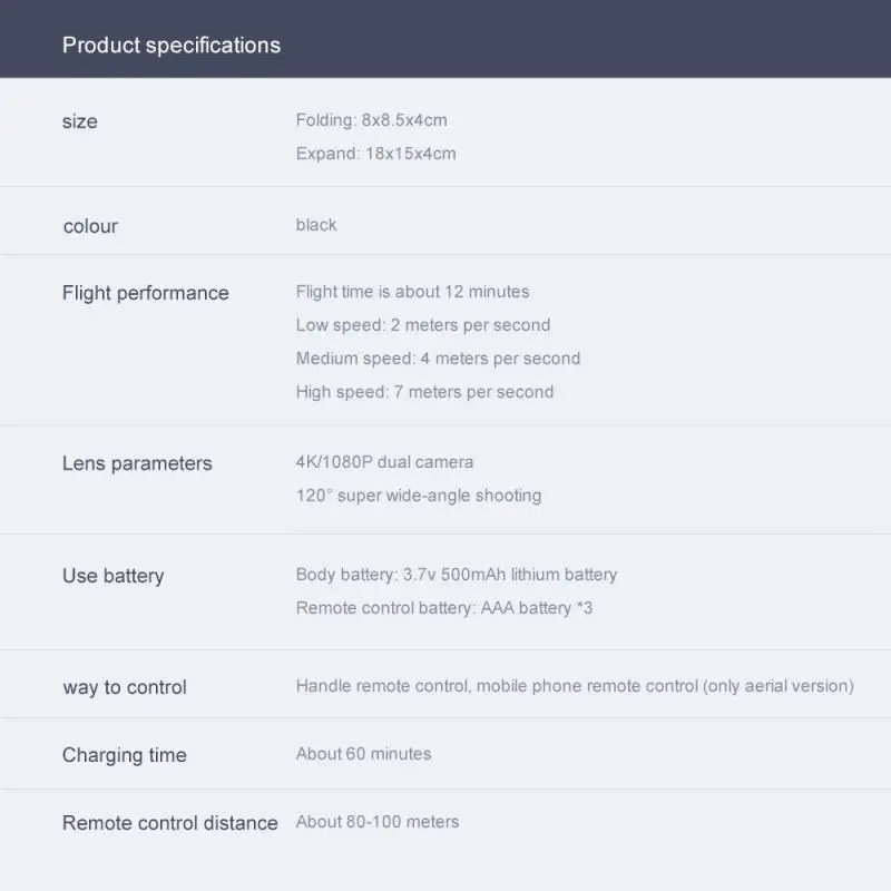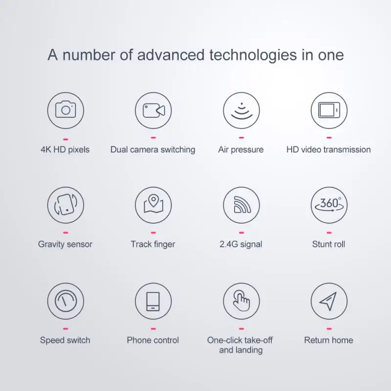 Функции: вверх/вниз, вперед/назад, влево/вправо, боковой F светильник, светодиодный светильник, Безголовый режим, автоматическая кнопка возврата, режим удержания высоты, Поворот на 360 °, wiFi FPV