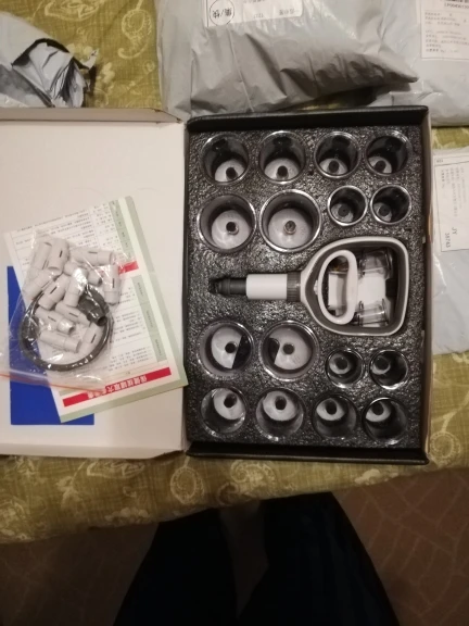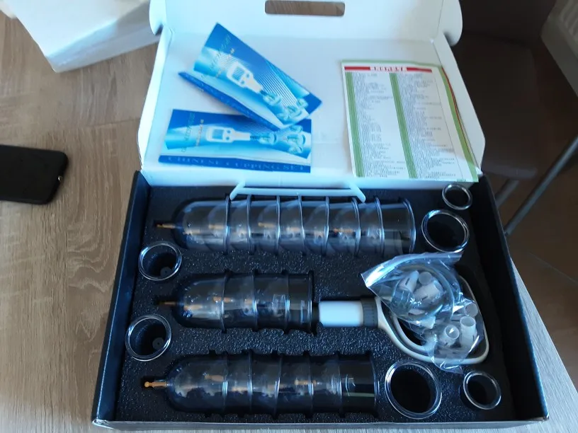 прилетели за две недели , качество на 4+, есть аналогичный набор от Огулова, эти чуть по тоньше , камера насоса чуть поменьше , выглядят немного побюджетнее , работу свою выполняют , в комплекте скребок гуаша , рекомендую!
