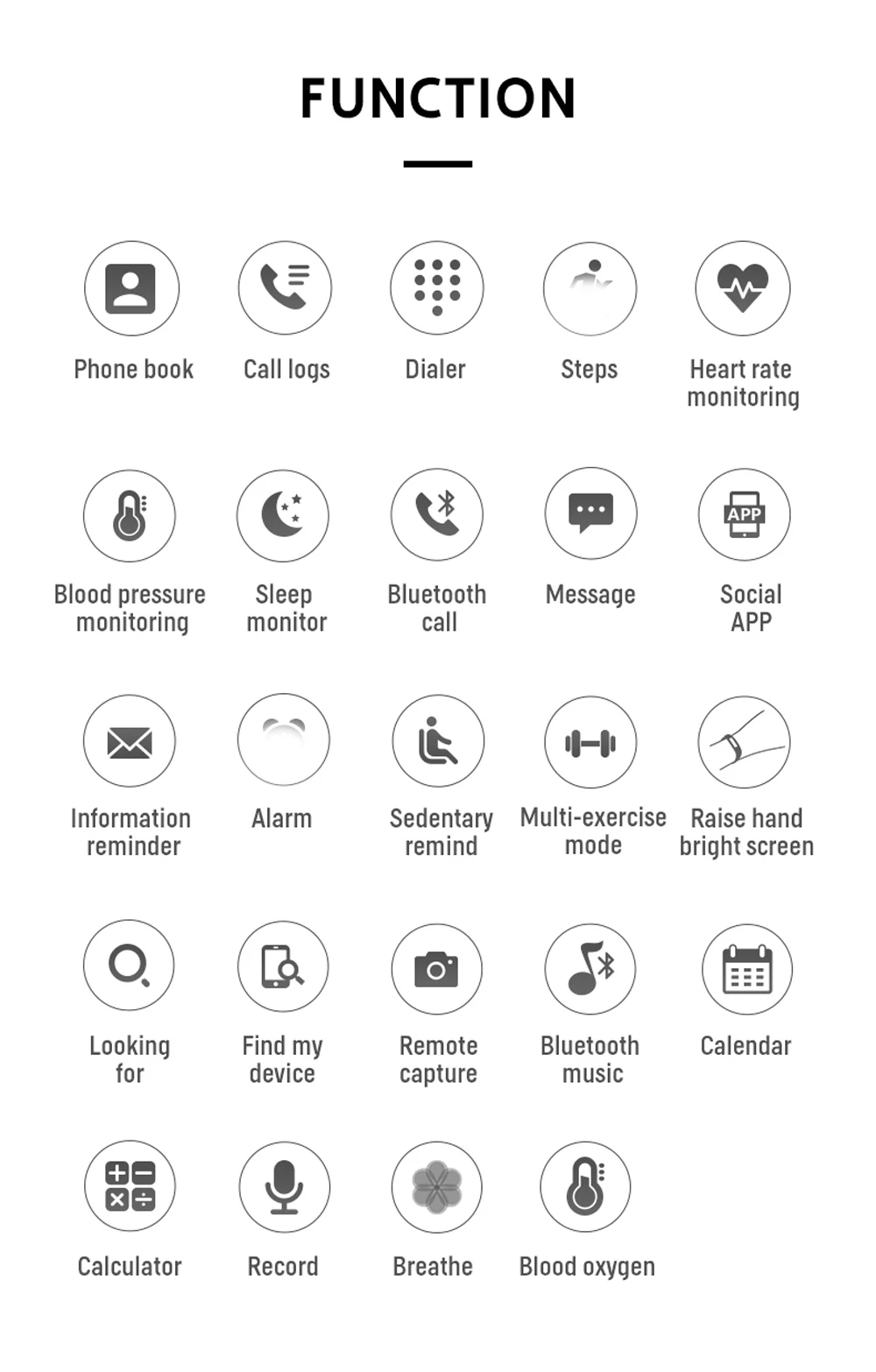 Длинный яркий дисплей, яркий экран на запястье, настраиваемая яркость, Тихий режим, найти браслет, WeChat спорт, встряхнуть фотографии, управление музыкой, толчок погоды, секундомер, будильник.