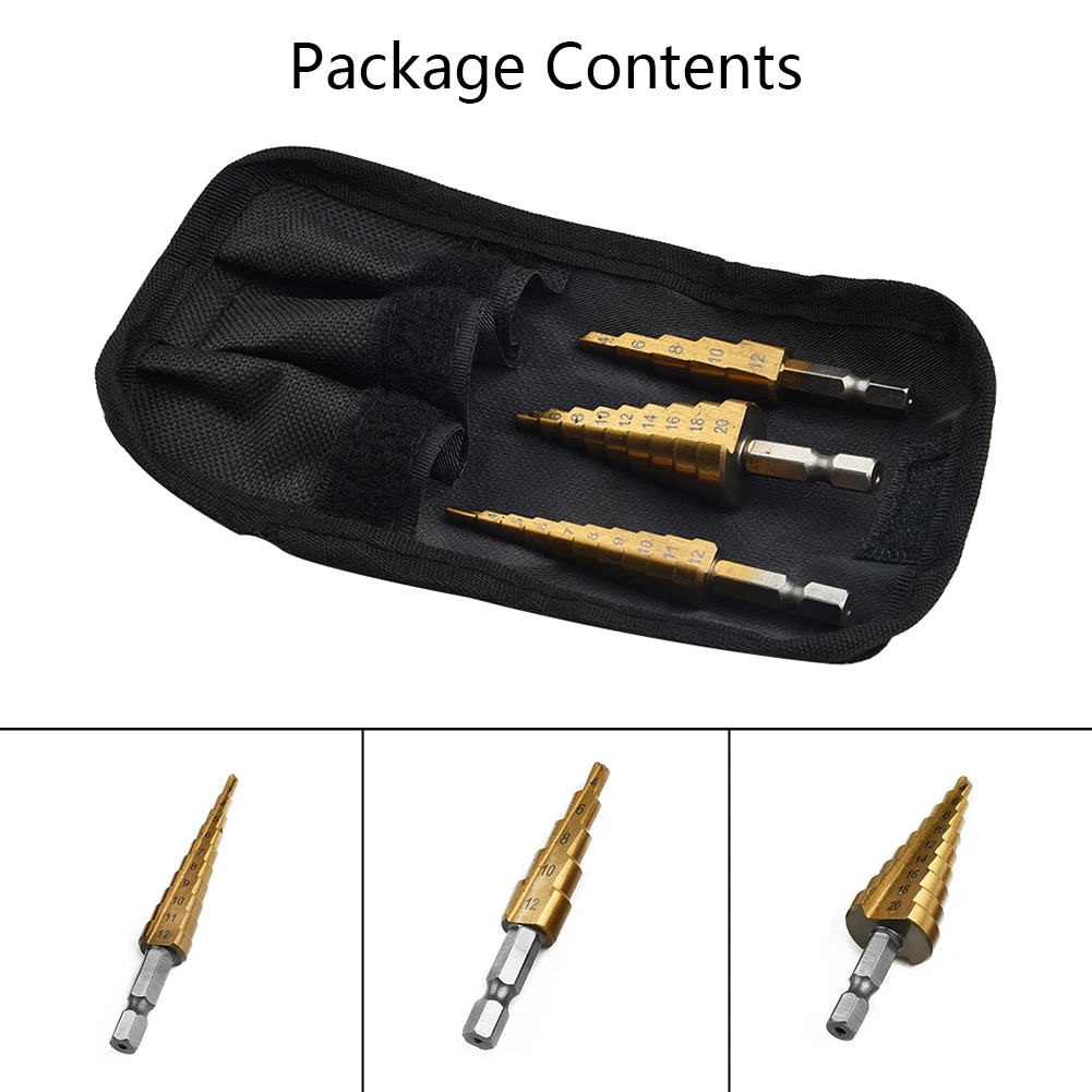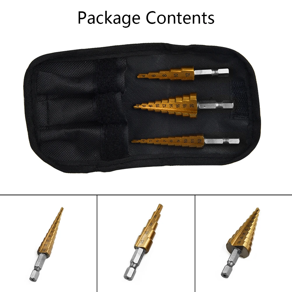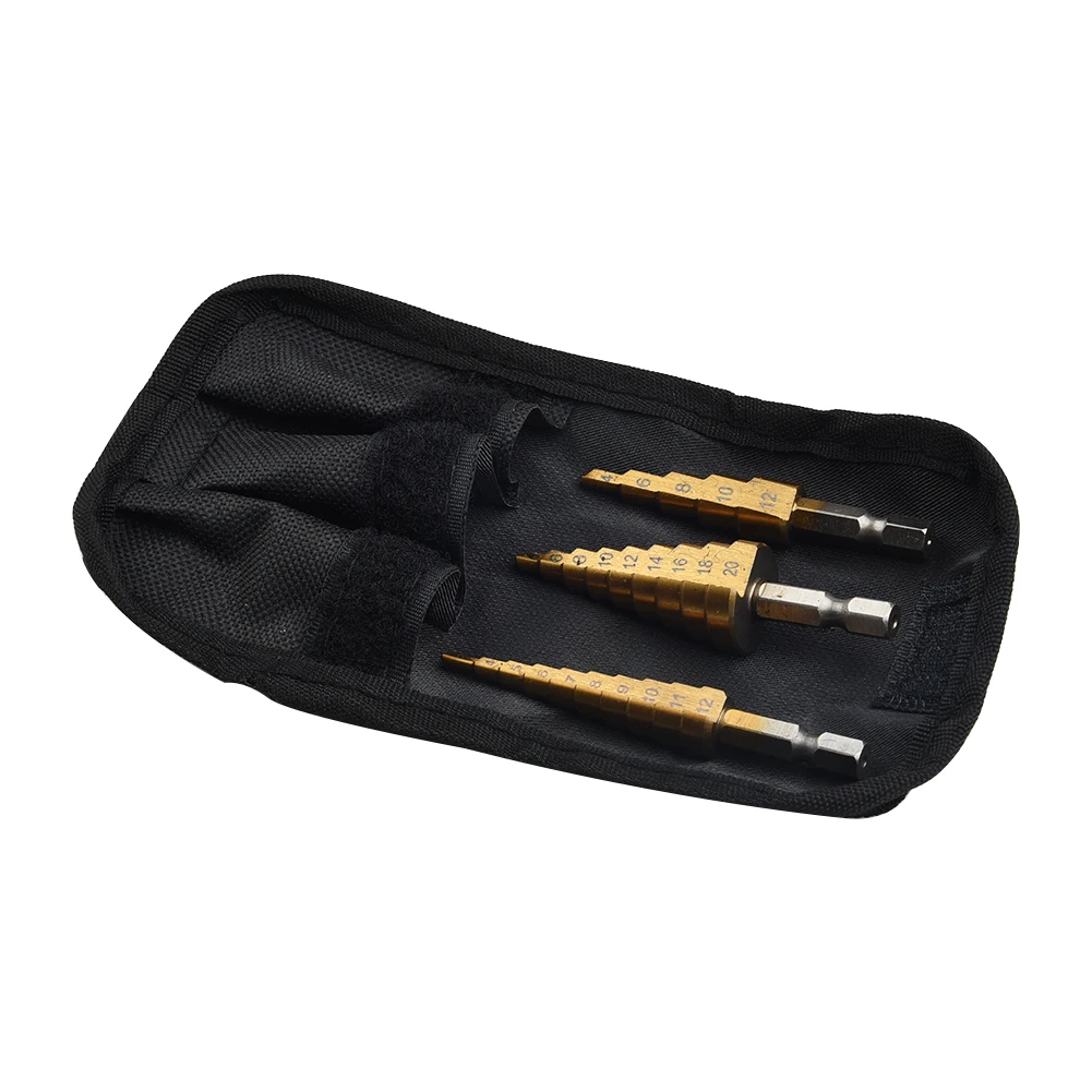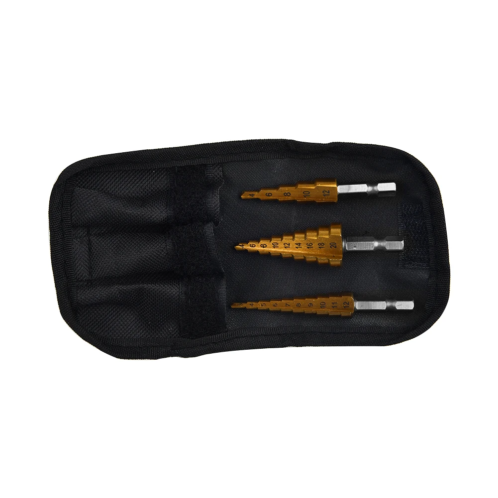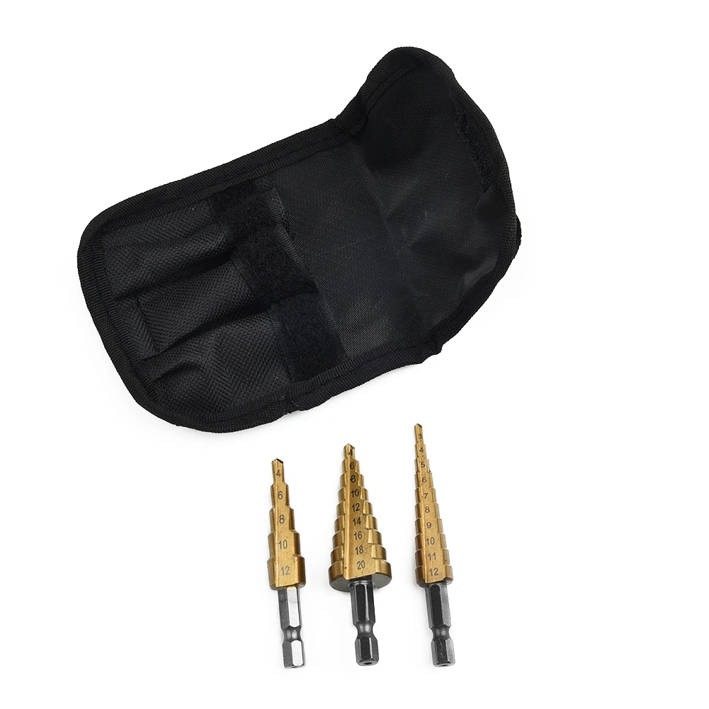 Набор ступенчатых Сверл из быстрорежущей стали, комплект из 3 насадок с титановым шестигранным хвостовиком, многофункциональный конусный резак для отверстий, конический, 4-20 мм3-12 мм4-12 мм с чехлом