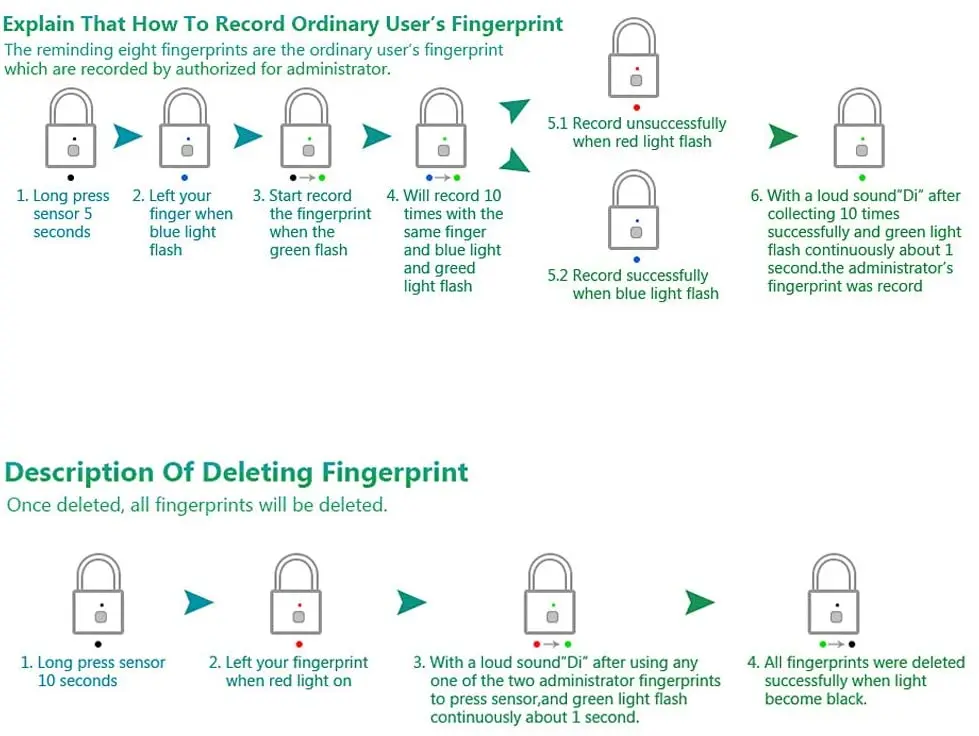 [SMART FINGERPRINT PADLOCK] без приложения, без ключа, без bluetooth. Дружественный детям и пожилым людям, ваш палец является ключом, который не позволяет вору взломать код. Не беспокойтесь о потере ключа или пароль известен вору, Потому что они не могут получить ваш палец. Красный светильник будет мигать в течение 10 секунд, когда батарея низкая, и 1000 разблокирует при полной зарядке, прежде чем батарея будет низкий светильник..