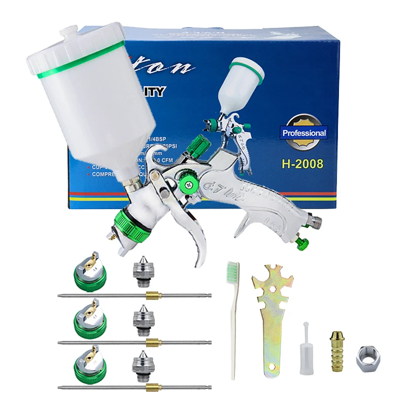 Рекомендуется для распыления базовых покрытий, прозрачных покрытий и других высоковязких покрытийПодходит для бытовой и промышленной грунтовки, верхнего покрытия и детализации для автомобильной промышленности, оборудования и окрашивания мебелиХарактеристики изделия:Материал распылителя: алюминиевый сплавМатериал чашки: ПВХ пластикТип: высокая громкость, низкое давлениеСопло для жидкости: 1,4 мм, 1,7 мм, 2,0 ммРасход воздуха: 14,5 куб. Футов в минутуРабочее давление: 2-3,5 барШирина узора: 160-240 ммРазмер бункера: диаметр 10 смВоздухозаборник: 1/4 дюймаЕмкость чашки: 600 куб. См