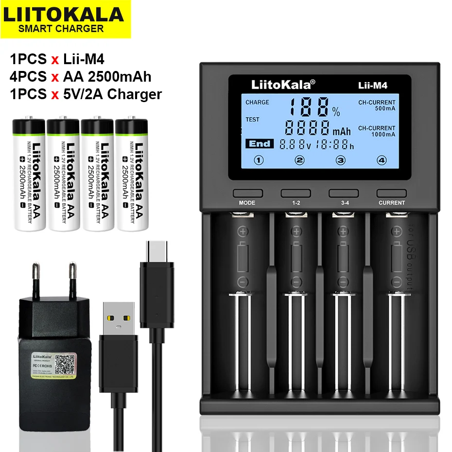 Новинка LiitoKala Lii-M4 18650 литий-ионная батарея умное зарядное устройство испытательная емкость + 4 шт. AA 1,2 V NiMH 2500mAh перезаряжаемые батареи