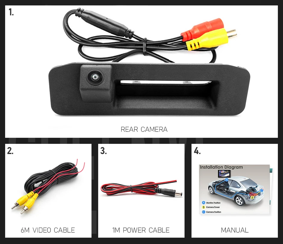 1. Задняя камера2. Коробка для посылка3. Видео кабель (6 м)4. Кабель питания5. Руководство пользователя