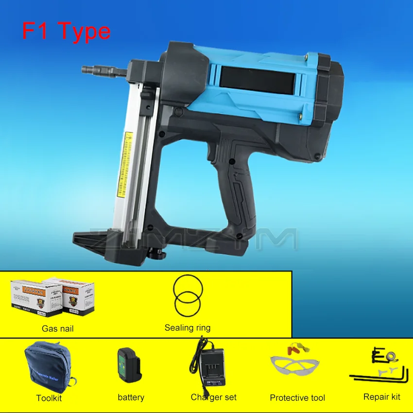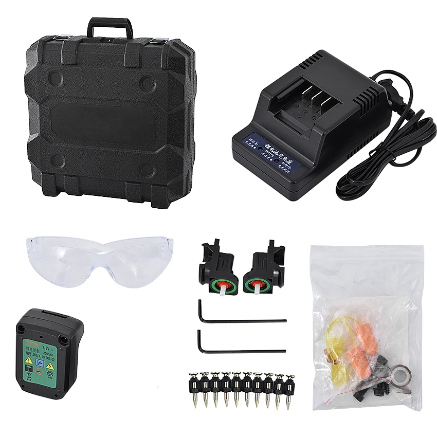 1 * пистолет для ногтей + 1 * аккумулятор + 1 * держатель + 1 * сумка + 2 * гвоздь (коробка) + 1 * очки + детали для инструментов