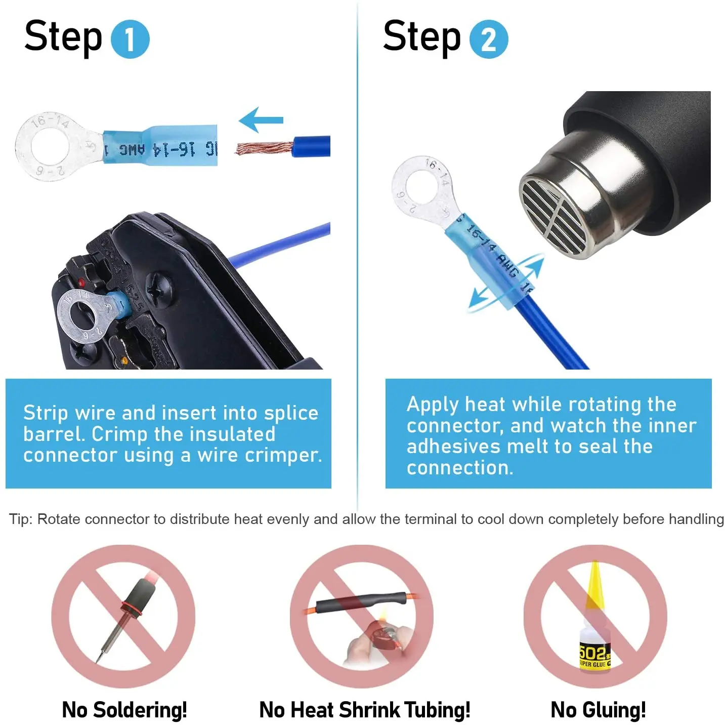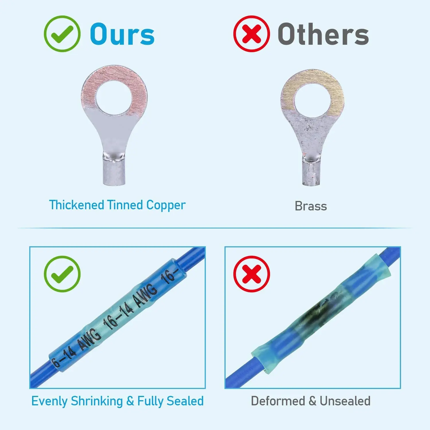 Легкость нанесения-изоляция провода, ОБЖИМНАЯ Клеммная бочка с проволочной обмоткой и нанесение тепла тепловым пистолетом при вращении соединителя. Термоусадочные трубки уменьшат размер и прилипают к проводу. Комплект для пайки не нужен. Начните делать безопасные и прочные соединения за считанные секунды.Долговечность-полупрозрачные термоусадочные трубки обеспечивают высокую прочность на растяжение, а также устойчивость к растягиванию и механическим повреждениям. Толстая бочка обеспечивает сильный обжим каждый раз-ваш провод никогда не выскальзывает из этих разъемов.Превосходный контакт с проволокой-медный бочонок обеспечивает повышенный ток и обеспечивает меньшее падение напряжения, предотвращая поломки проводки и уменьшая время простоя оборудования.Цвет изоляции терминала представляет размер проводки, которая подходит для терминала.