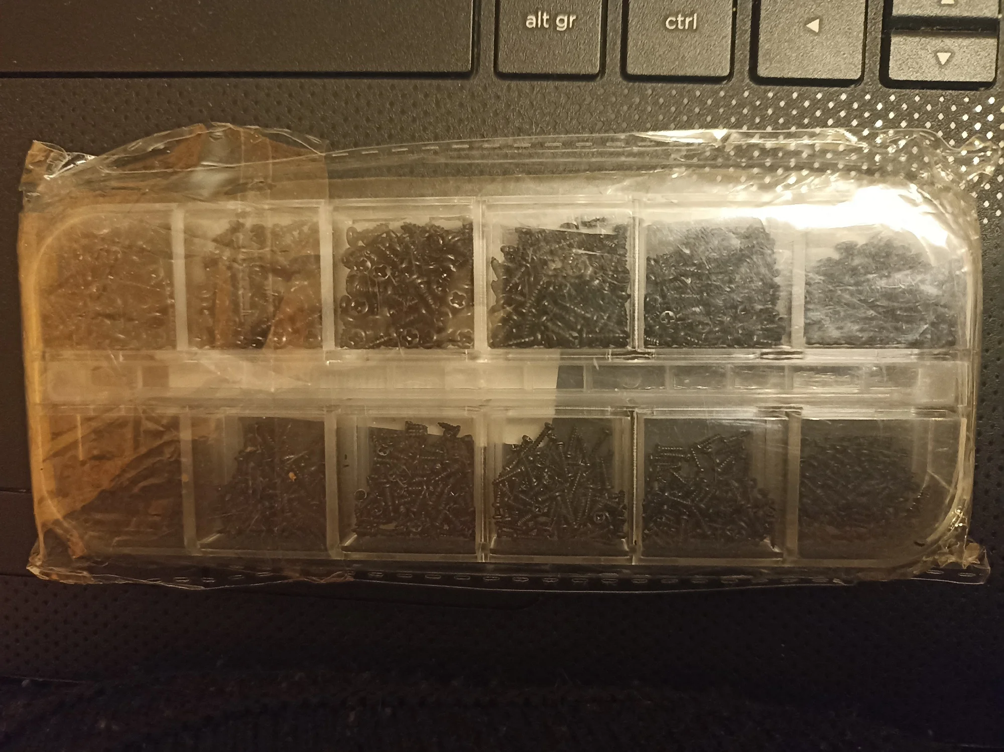 Коробка неудачная. Часть крышек не закрываются - не фиксируются в закрытом состоянии. Некоторые шурупы высыпались в пластиковый пакет. Придётся куда то пересыпать это всё...