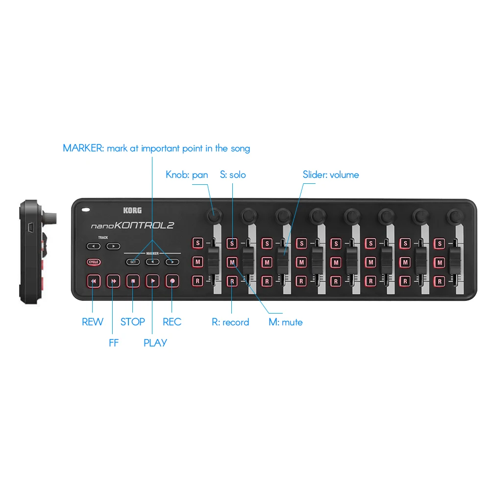 Особенности: Стильный цвет и удобный компактный размер Супер легкий и компактный корпус, удобно носить с собой; Доступный выбор цвета: черный или Ярко-белый. Полный контроль для DAW/программного синтезатора Ручка, фейдер и 3 переключателя для каждого из 8 каналов, плюс кнопка маркера позволяют легко управлять и эффективно производить песни. Ручка-панорама, слайдер-громкость, кнопка S-solo, кнопка M-отключение звука, кнопка R-запись, кнопка маркера-назначение отметок в важный момент песни Простое использование и широкий спектр поддерживаемых программного обеспечения Чувствительные кнопки обеспечивают легкое управление. Многие программы поддерживаются, что уменьшает сложные настройки подключения. Usb-питание для полной установки Просто Подключите компьютер и контроллер к usb-кабелю, быстро получить музыкальную производственную систему. Питание и MIDI данные перемещаются по тому же проводу для чистого рабочего пространства. Конкретные настройки с помощью программного обеспечения Он работает с программным обеспечением «KORG Kontrol Editor» (можно загрузить на веб-сайте KORG), которое обеспечивает детальные настройки по индивидуальному заказу. Характеристики: Бренд: KORG Модель: Контро2 Материал: АБС-пластик Цвет: черный, белый (по желанию) Макет контроллера: 8 ручек, 8 ползунков, 24 кнопки, транспортные кнопки (REW/FF/STOP/PLAY/REC, кнопка цикла, кнопка маркера, кнопка отслеживания) Интерфейс: Mini-USB Потребляемая мощность: менее 100 мА Рабочие требования: -- Macintosh Поддерживаемый компьютер: совместим с компьютером Apple Macintosh с usb-портом, удовлетворяющим требованиям операционной системы Mac OS X Поддерживаемая ОС: совместимость с Mac OS 10,8 Mountain Lion или более поздней версии -- Windows Поддерживаемый компьютер: совместим с компьютером с usb-портом, удовлетворяет требованиям ОС Windows S7 (рекомендуется набор микросхем Intel USB) Поддерживаемые ОС: совместимость с Microsoft Windows 7 SP1 или более поздней версии (32 бит/64 бит) Размер: 32,5*8,3*3,0 см/12,80*3,27*1,18 дюймов Вес: 293 г/10,33 унций Вес посылка: 430 г/15,16 унций Размер посылка: 37*9,5*4,0 см/14,56*3,74*1,57 дюймов Примечание: Только контроллер и usb-кабель, другие аксессуары на фотографиях не включены. Из-за ручного измерения возможны отклонения. Из-за освещения или по другим причинам изображение и материал объекта могут немного отличаться. Упаковочный лист: 1 * контроллер 1 * USB кабель