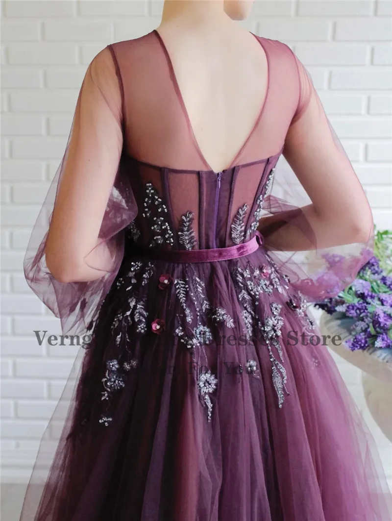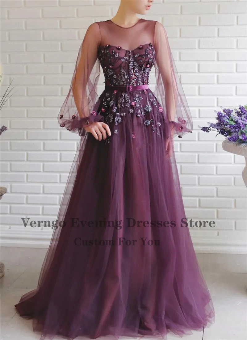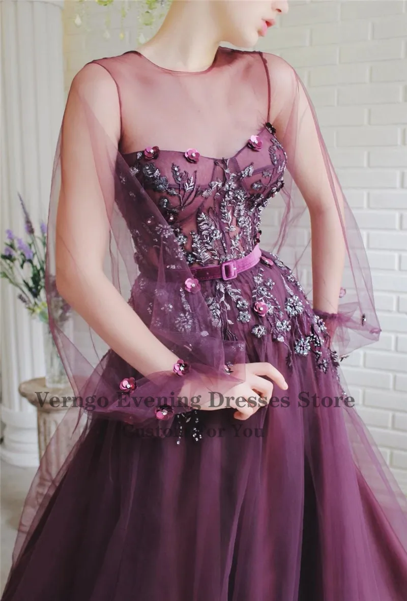 Verngo элегантные фиолетовые тюлевые платья для выпускного вечера 2021 пышные Длинные рукава 3D Цветы О-образный вырез с велюровым поясом на заказ