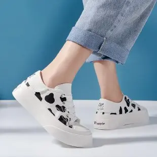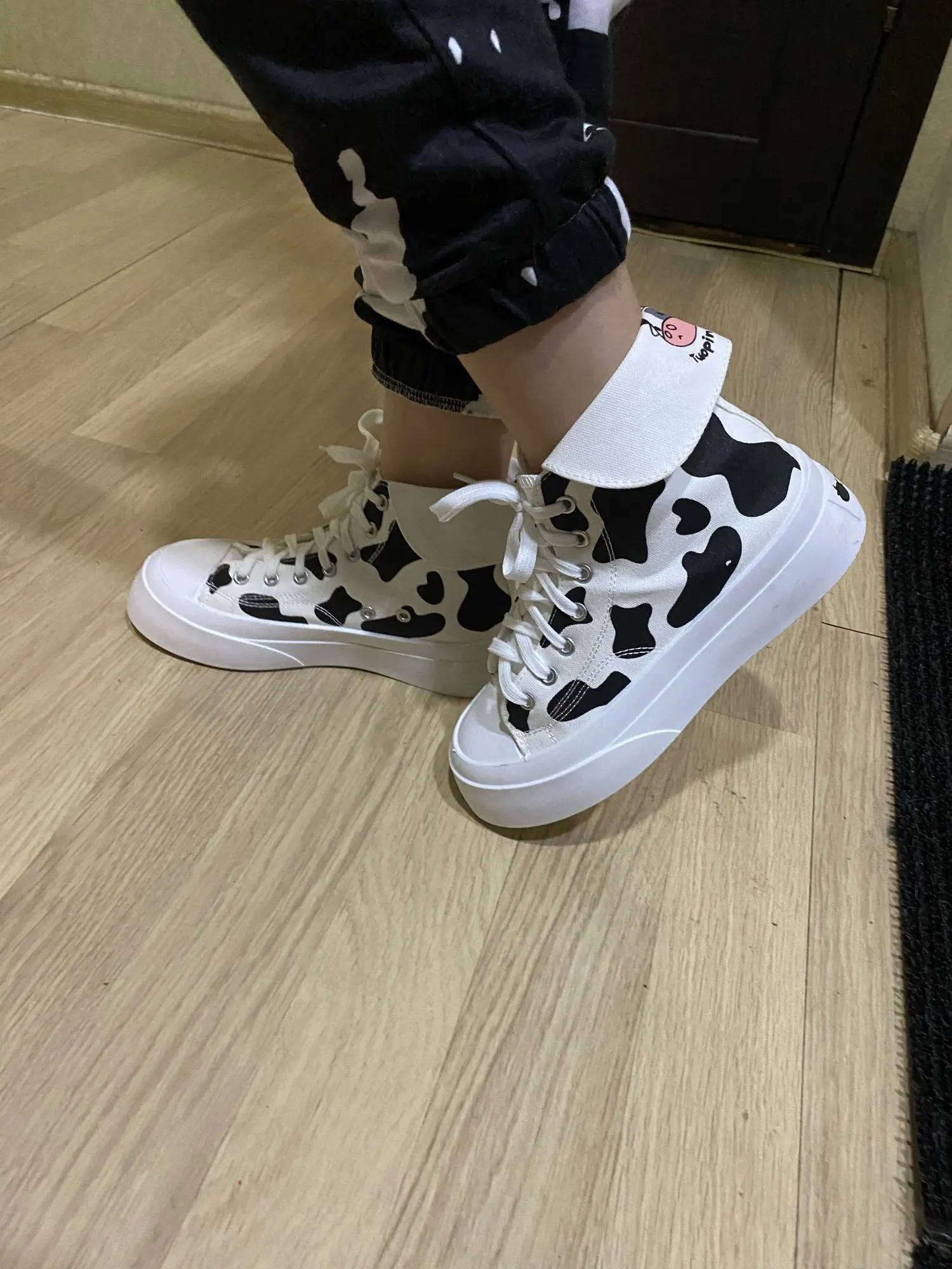 Поставляется в хорошем состоянии и очаровательно! На передней части обуви есть пятна грязи, а на задней части обуви-1 принт с коровой, но я все еще люблю его ^;