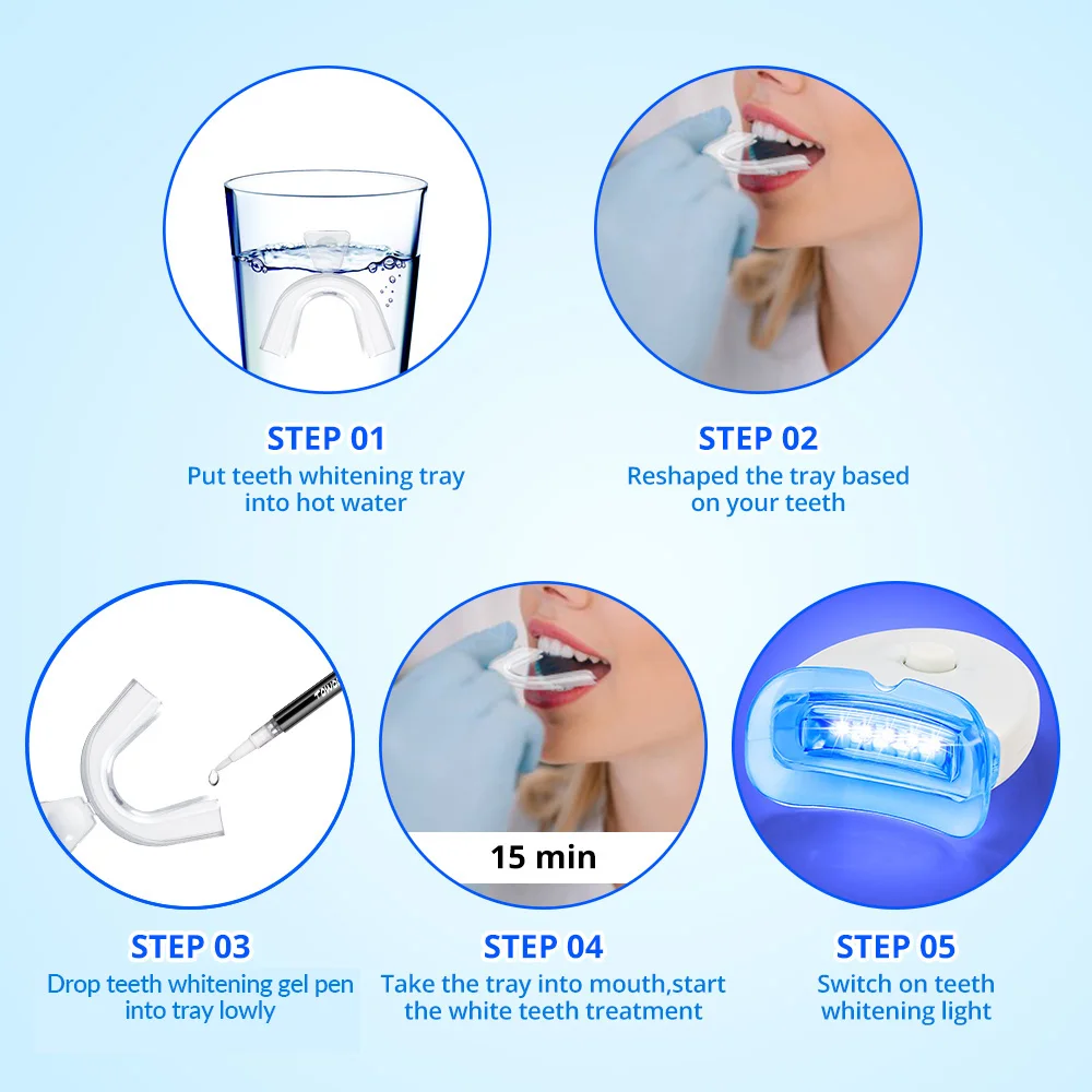 Шаг 1: Заполните подносы.Нагрейте горлышко под 80 ℃ горячей водой и разогрейте его около 10 секунд. Наденьте поддон на зубы, аккуратно Используйте пальцы, пока они не придадут зубам форму, плотно прилегают к зубам.Шаг 2: Сравните направляющую по затенению зубов.Шаг 3: нанесите тонкий слой отбеливающего геля на обе капы и равномерно распределите (от 0,25 до 0,4 мл на каждую капу, больше нет необходимости).Шаг 4: Поместите капы в рот и поверх зубов, плотно прилегайте к зубам.Шаг 5: попросите покупателя вставить лоток на 10 минут или на 7 минут, затем краску водой.Шаг 6: После отбеливания зубов используйте спрей для рта. Это даст вам свежее дыхание. Повторите это полное лечение 2 зубца убедитесь, что вы краску и высушите лоток между сеансами, или один раз в день, через 3 дня, сравните до и после с руководством по тени зубов, мы можем улучшить оттенок зубов на 7-10.