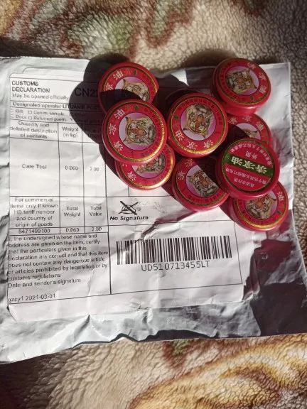 Получила как заказывала 10шт показываю в сравнение мазь звёздочку из нашей аптеки. Звездочка побольше, запах более яркий и на донышке написано, что из Вьетнама. Эта тигровая неизвестного производителя. Цвет почти одинаковый. Вот пока и все.