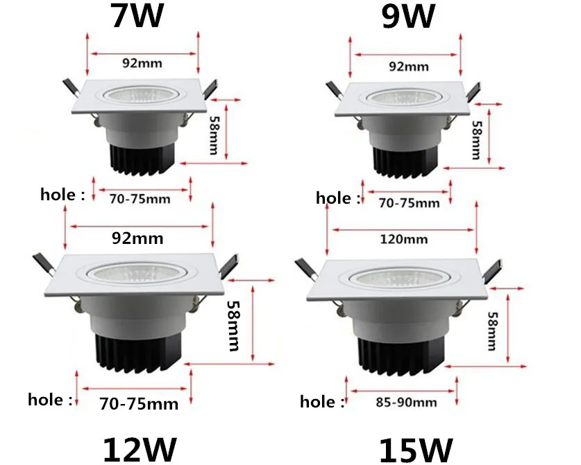 Белый приглушаемый Светодиодный точечный светильник, 7 Вт, 9 Вт, 12 Вт, 15 Вт, 35 Вт, cob Светодиодный точечный светильник 220 В110 В, Потолочный встраиваемый Точечный светильник, Квадратный светодиодный панельный светильник